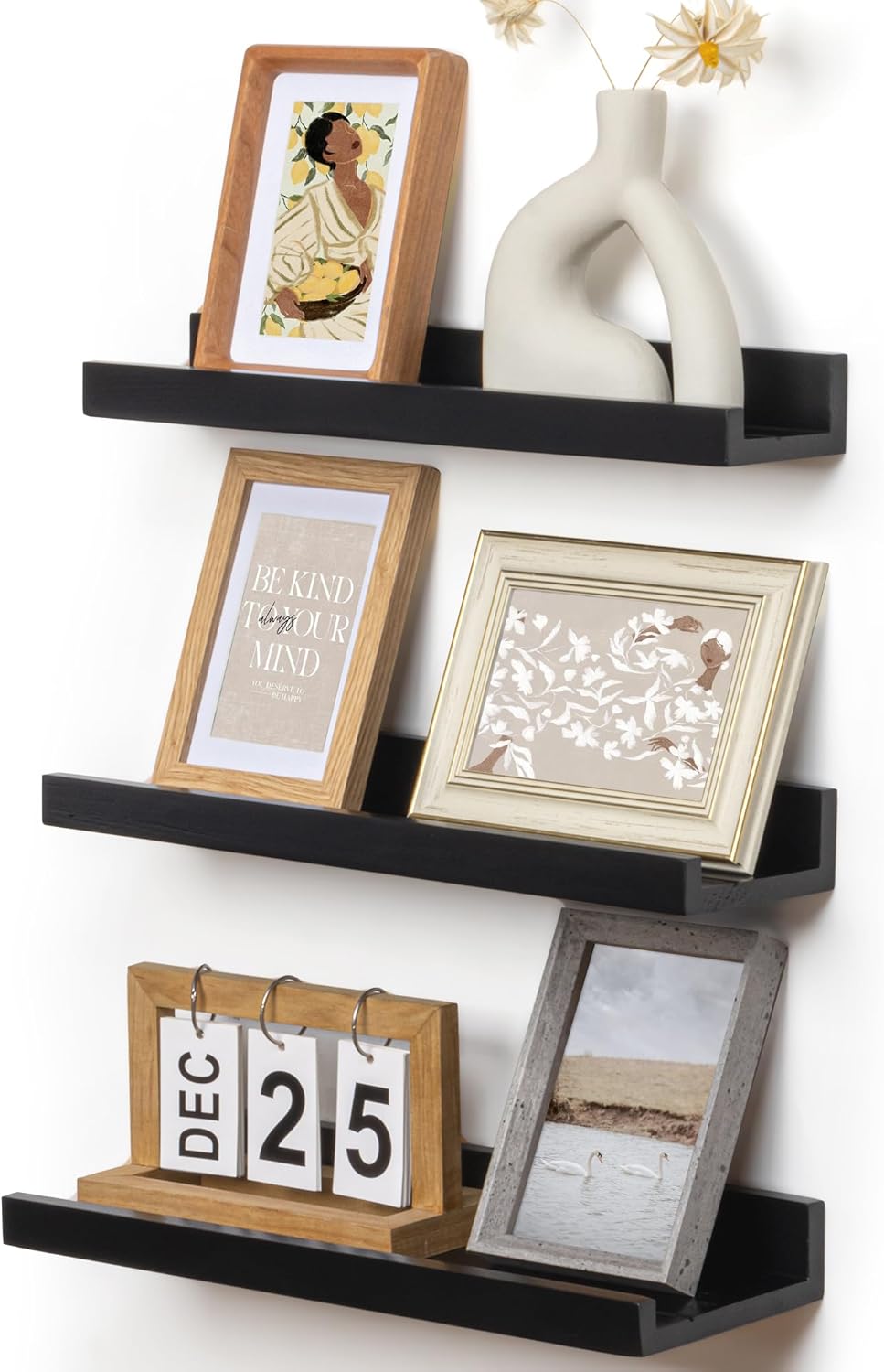 Picture Ledge Wall Shelves - 16 Inch Width Set of 3, Solid Pine Wood Rustic Floating Ledge Shelves for Kids' Room, Bedroom, Kitchen, Bathroom, Living Room, Nursery Display Decor, Black