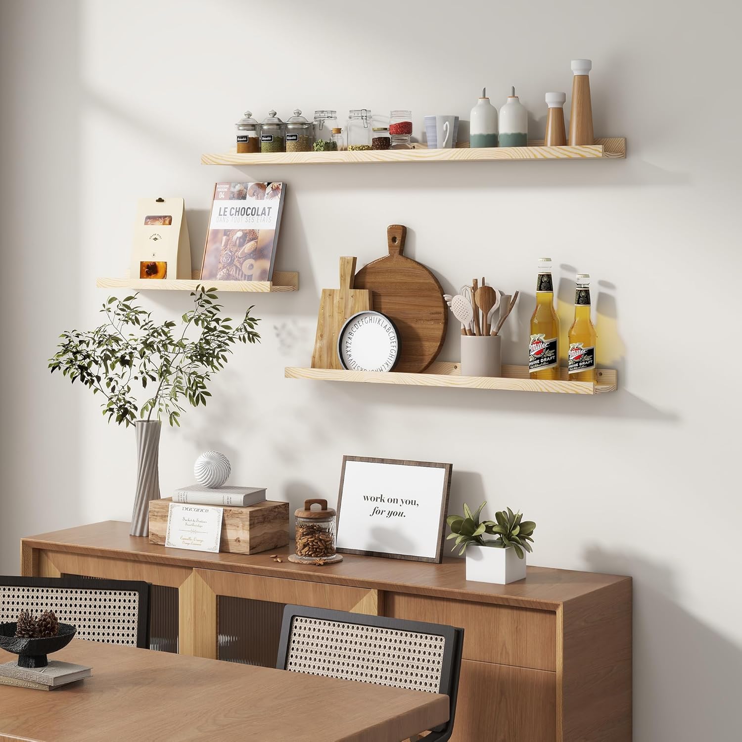 - Easy to Install: You will get a level, screws for the wall, drywall anchors, a detailed installation guide, and two beautiful hand-crafted solid pine wood shelves. With the level, you can make sure your picture ledge shelves are well aligned. Just follow the simple instruction to install the hanging shelves for wall decor within 10 minutes. We add additional screw and anchor to the hardware bag just in case. If you have any questions about our products, please feel free to contact us