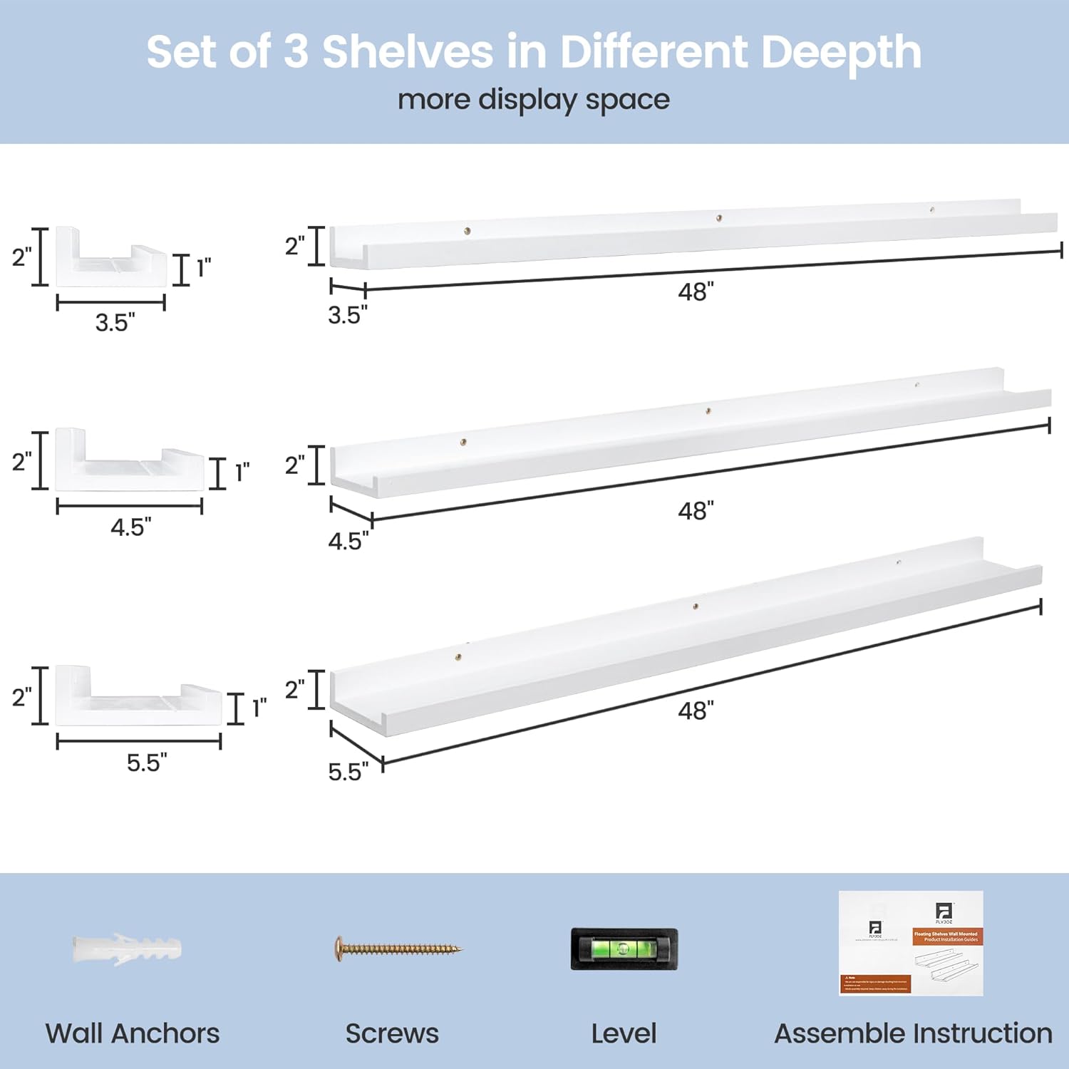 Picture Ledge Shelf for Wall, 48 inches Solid Pine Wood Nursery Book Shelves 3 Pack, Floating Ledge Shelves for Kids' Room, Bedroom, Bathroom Long Floating Shelves for Wall, White