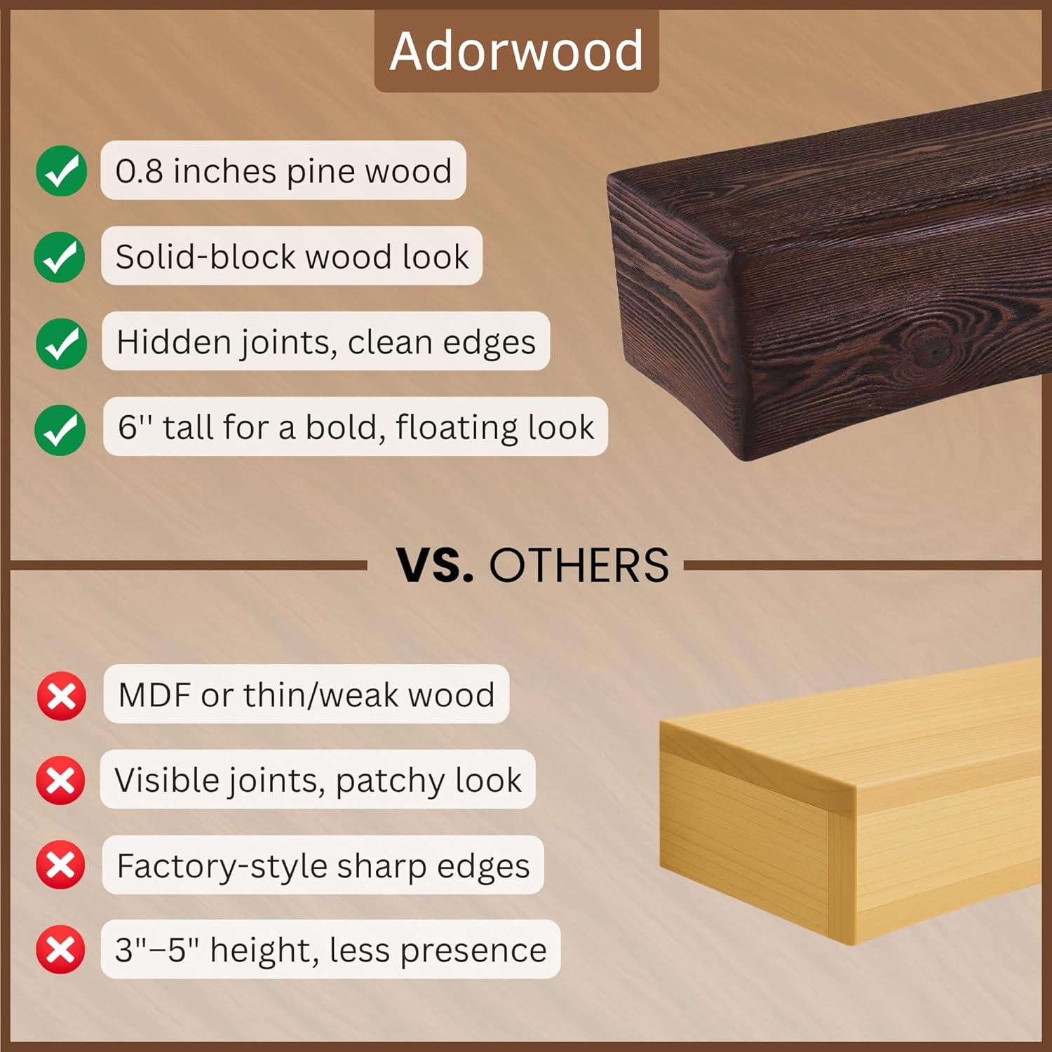 - GENUINE PINE WOOD TEXTURE: Each piece reveals natural knots, small cracks, and unique distressing, ensuring every mantel is one-of-a-kind. Due to the inherent characteristics of real wood, the grain and color may slightly differ from the samples shown.