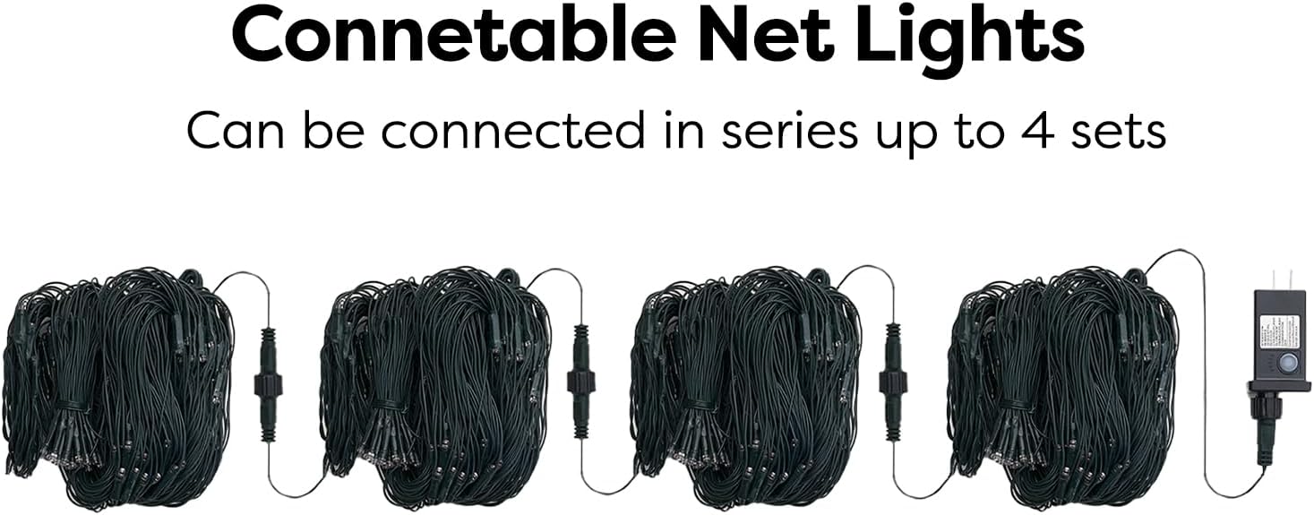 - End to End Connectable Design: Each set of our Xmas net lights come with male and female connector, allowing them to be connected in series with each other. It supports up to 4 strands be connected, totally 1440 LEDs, achieving the ability to control multiple net lights with only one electrical socket. Attention: If connected more than 5 strands, it will cause the brightness to gradually decrease.