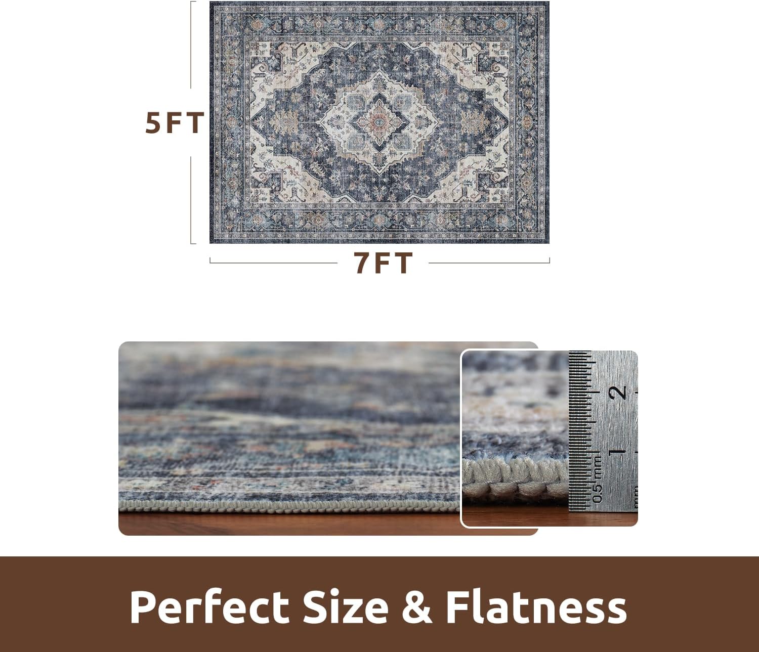 AMOAMI-Area Rug 5X7 Rugs for Living Room-Vintage Soft Blue Rugs for Bedroom-Non Slip Carpet-Machine Washable Rug for Dining Room Living Room Bedroom Office Under Table