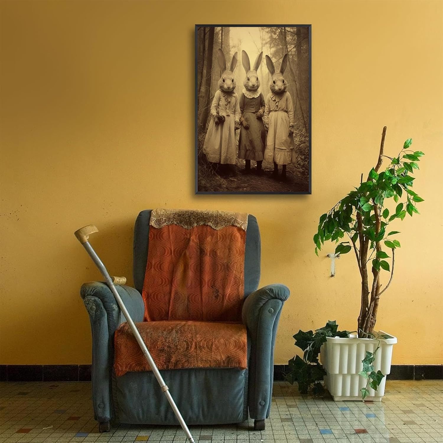 Vintage Horror Spooky Three Rabbits In Occult Forest Spooky Canvas Wall Art Poster Gothic Dark Academia Decorations Room Creepy Print Retro Halloween Wall Decor 24X36inch Aluminum Framed