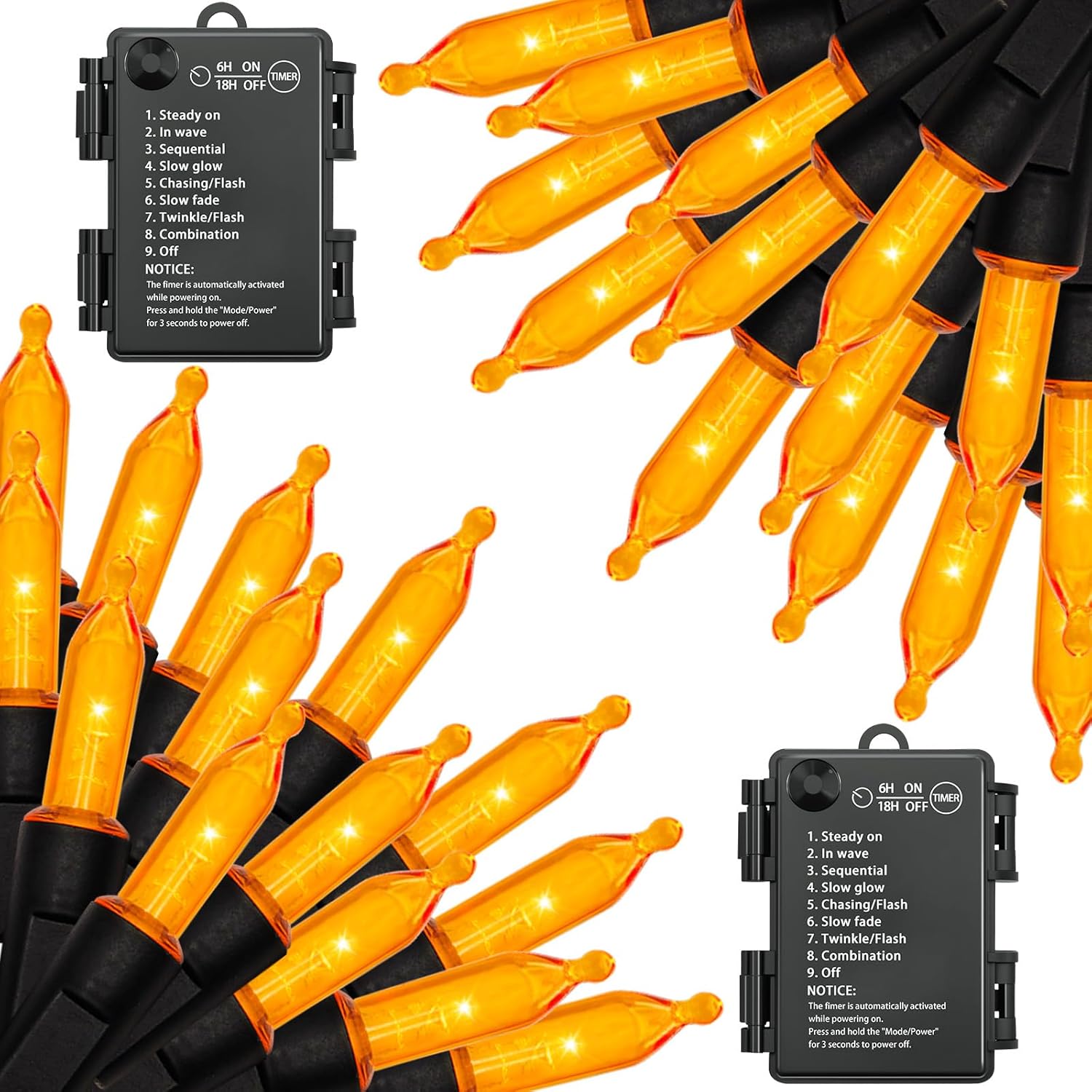 - 【8 Lighting Modes with Timer 】 These Orange Halloween Lights feature fantastic lighting effects with 8 Spooky Lighting Modes and press and hold the mode & power for 3 seconds to power off. Easily switch between Combination, In Waves, Sequential, Slow Glow, Chasing/Flash, Slow Fade, Twinkle/Flash, and Steady On, using the button on the battery case. Automatically controls a 6-hour on/18-hour off timer.