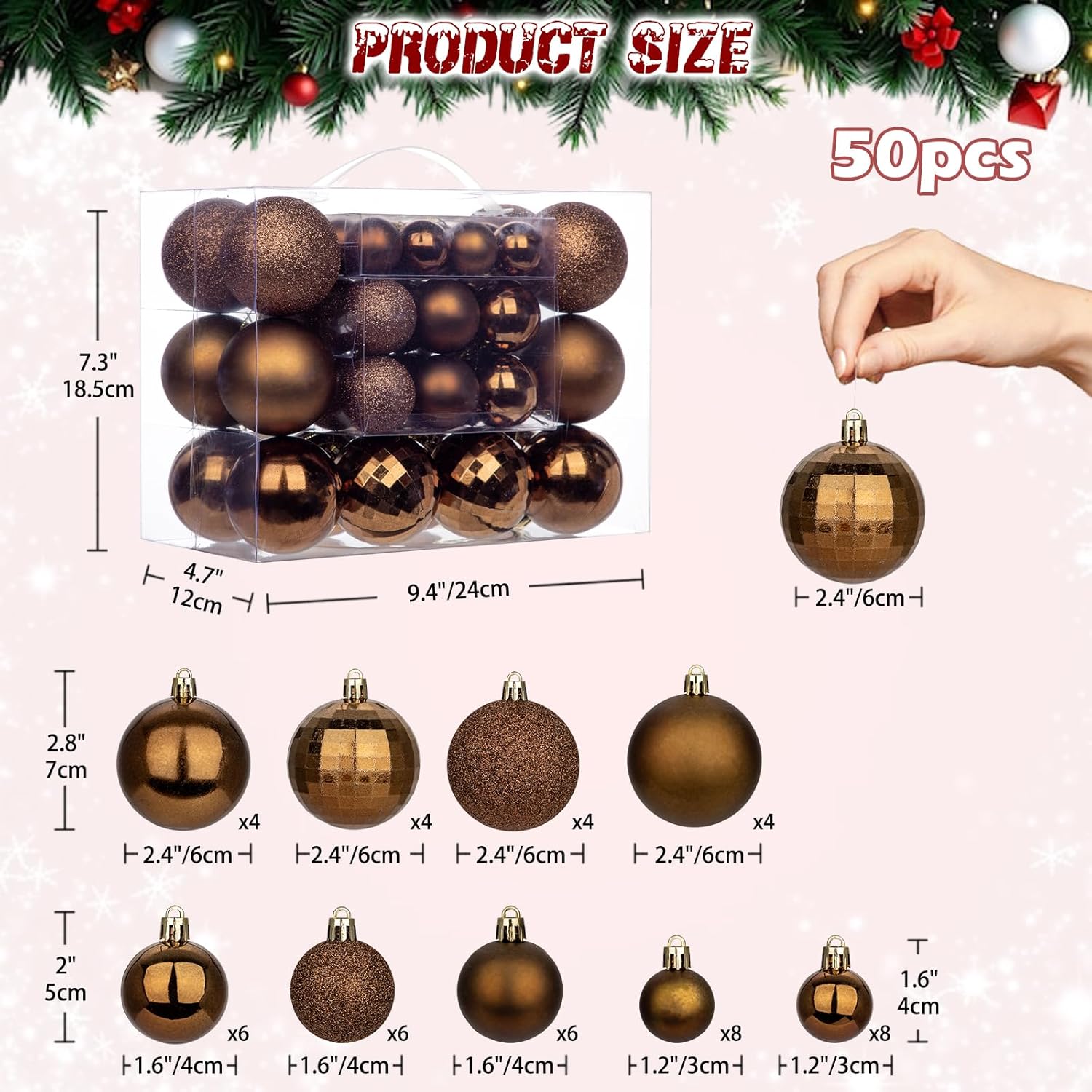 - Christmas Ball Ornament Size: The 50Piece christmas ball ornament set includes 16 small balls (1.18", 3cm), 18 medium balls(1.57",4cm), and 16 large balls (2.36",6cm), Perfect to decorate a whole normal size christmas tree. Tree balls with light weight and won't weigh down the Christmas tree branches. Exquisite tree baubles that create stunning Christmas theme and add stronger festive atmosphere