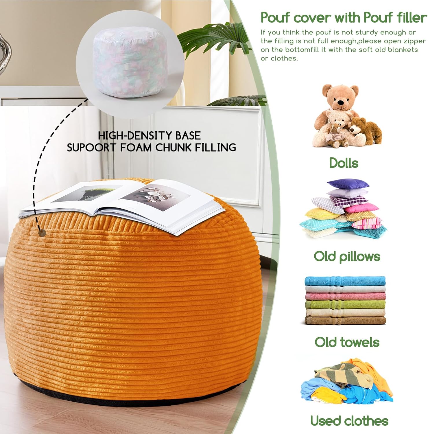 HIGOGOGO Round Stuffed Pouf Ottoman, Corduroy Poufs with Foam Chunk Filling, Furry and Fluffy Pouf Foot Stool Storage Ottoman, 26 X 18 Floor Poufs Foot Rest for Living Room, Orange