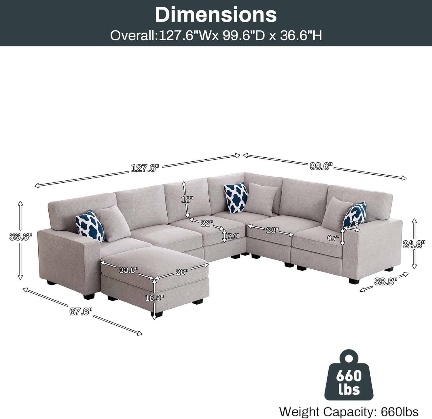 - Product Dimensions : 99.6"D x 127.6"W x 36.6"H