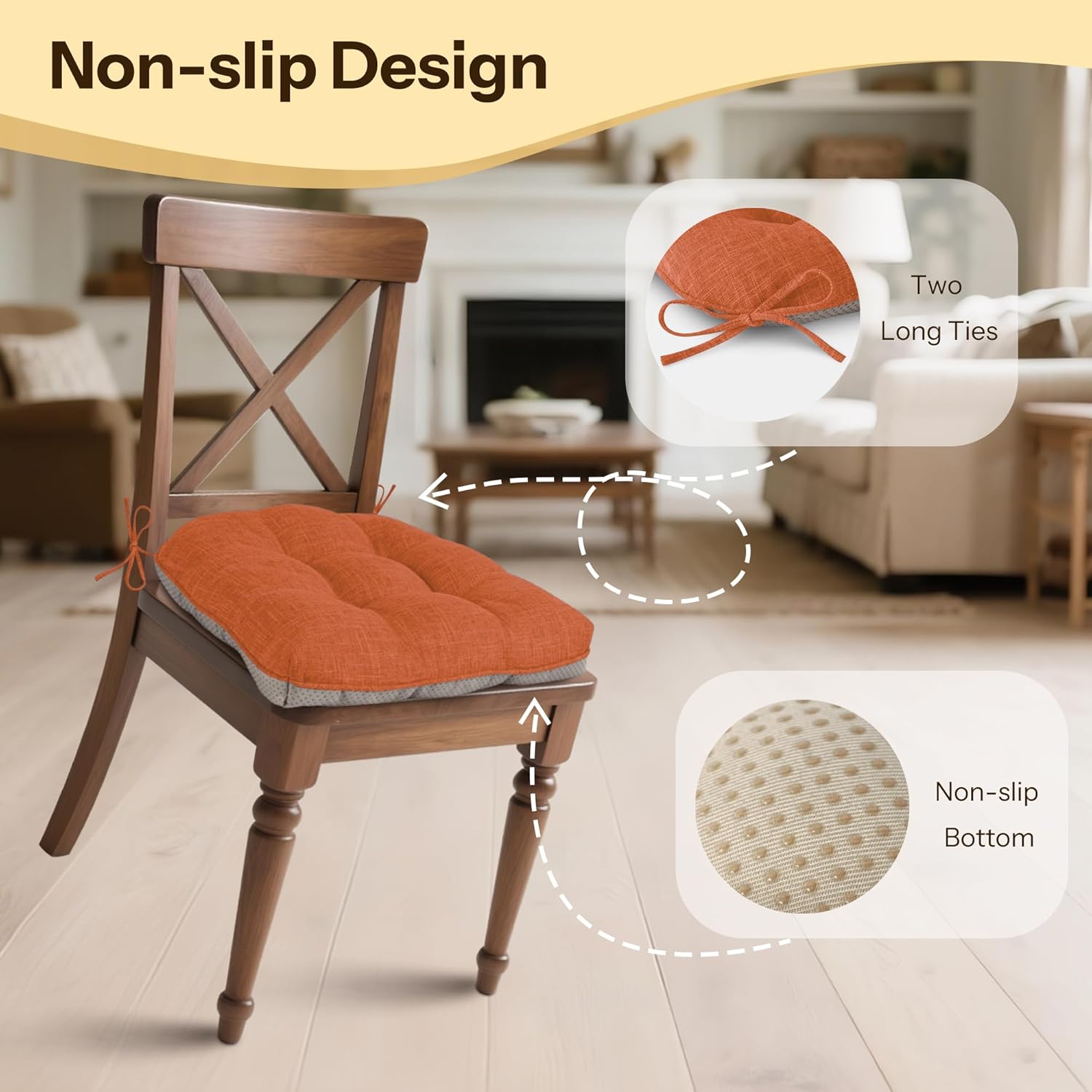Non Slip Chair Cushions for Dining Chairs Set of 4 Kitchen Chair Cushions 18"x18"x3" Turfted Chair Pads Comfortable and Soft Seat Cushion with Ties, Orange