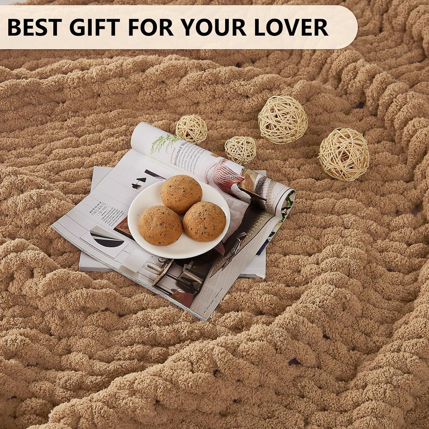 L'AGRATY Chunky Knit Blanket Throw: 60''x80'' Chenille Chunky Knitted Throw Blanket for Bed Couch - Handmade Thick Big Cable Knit Blanket - Large Crochet Rope Blanket for Home Decor(Tan)