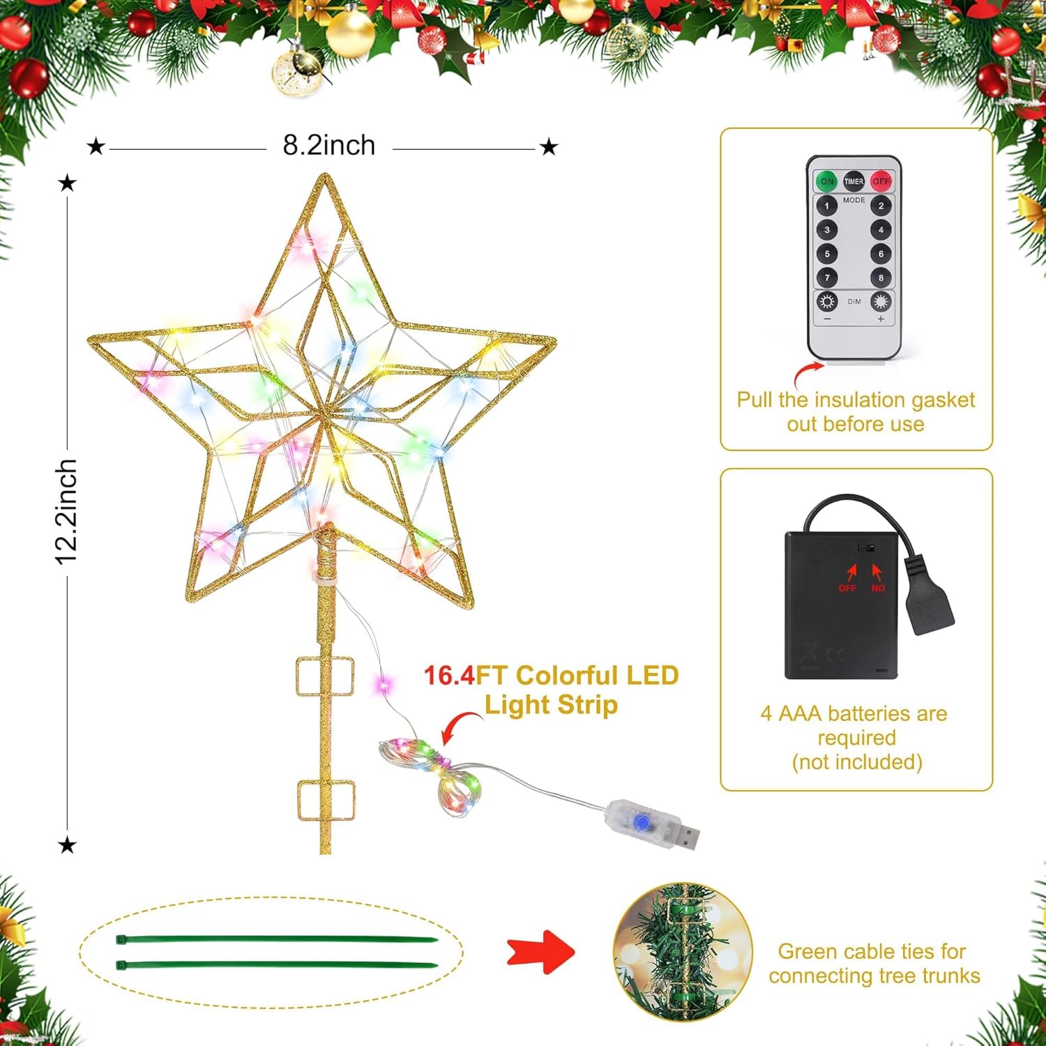 - Convenient Remote Control And Extra Battery Box (Battery not include):Christmas star topper came with timer remote control which includes 8 mode strobe light options,brightness- and brightness+. An extra Battery Box could lighted Christmas tree topper without charger.Perfect on Christmas decorations