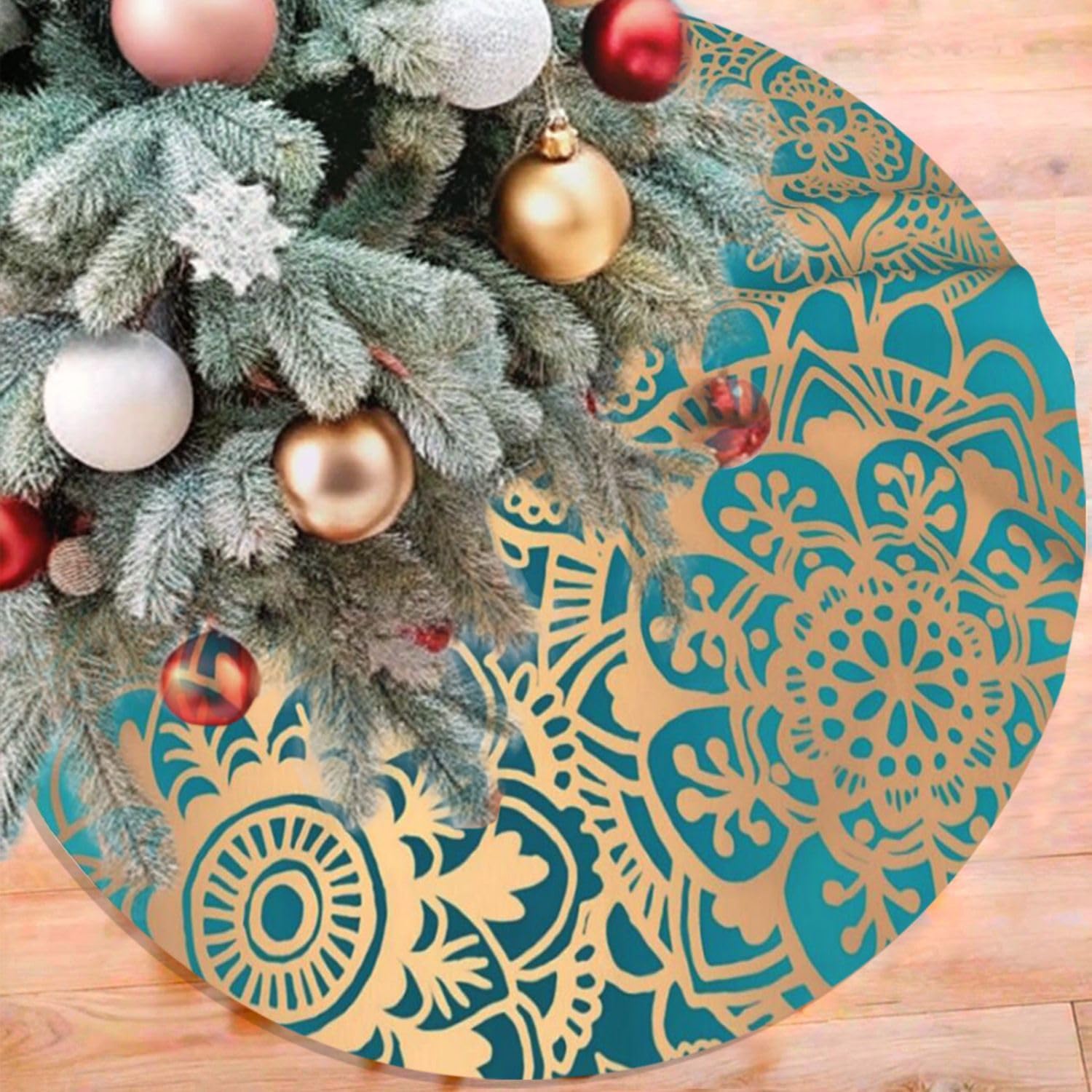 48" Large Christmas Tree Skirt, Elegant Teal Green Mandala Pattern Pattern Tree Mat Base Cover for Xmas Festive Holiday Party Decoration Ornaments