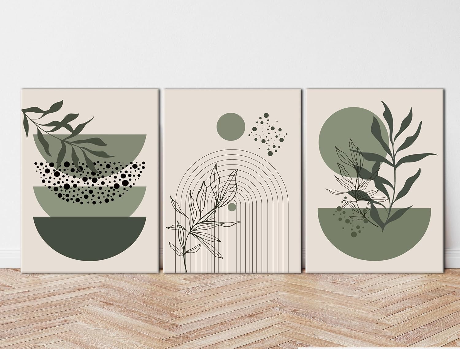- Sage Green Boho Wall Art: This set of three Framed Sage Green Boho Wall Art pieces features abstract botanical leaf and geometric line designs, ideal for adding a minimalist, modern boho touch to any room. The combination of sage green and beige creates a soothing aesthetic.