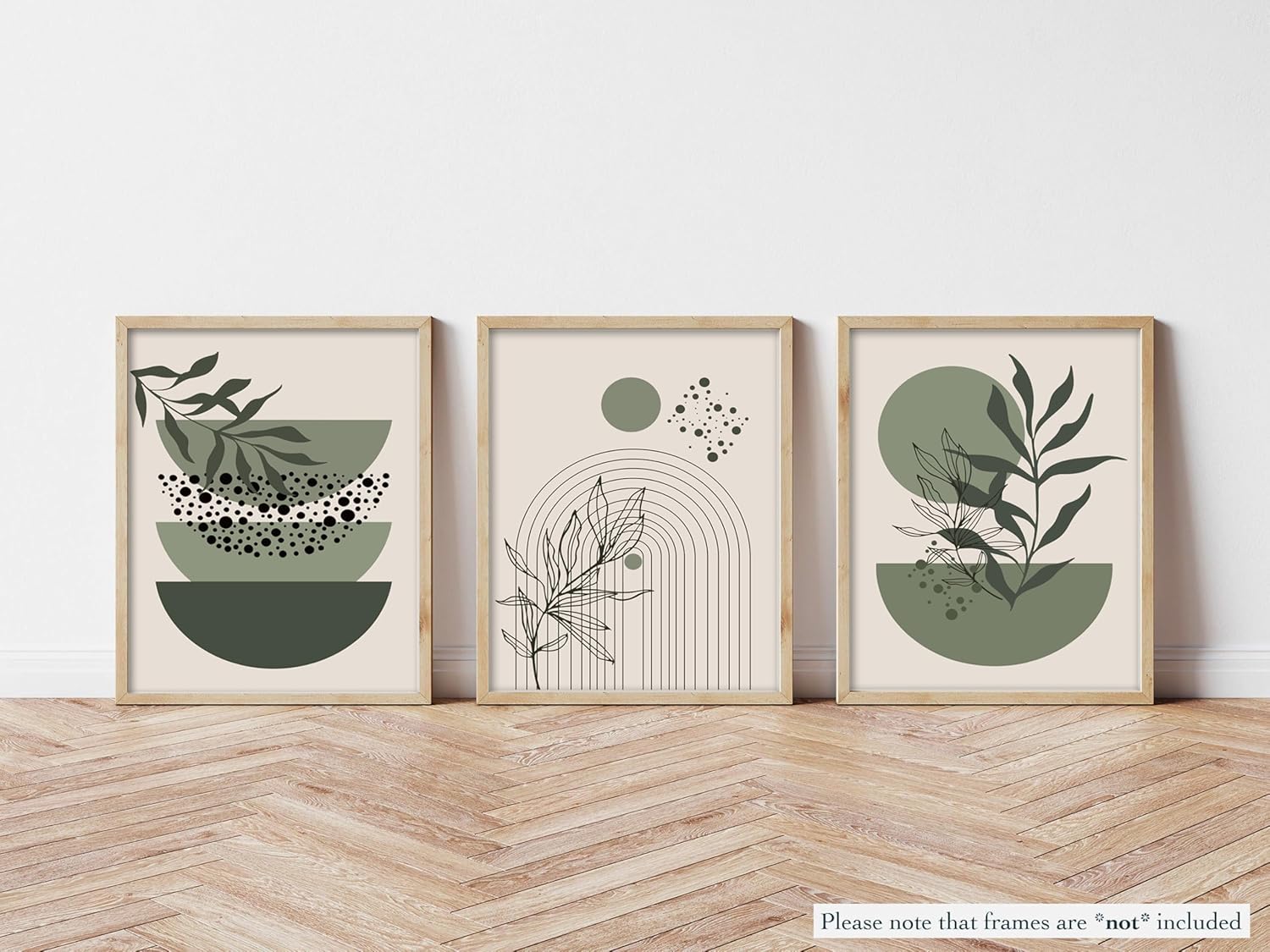 - Sage Green Boho Wall Art: This set of three Framed Sage Green Boho Wall Art pieces features abstract botanical leaf and geometric line designs, ideal for adding a minimalist, modern boho touch to any room. The combination of sage green and beige creates a soothing aesthetic.