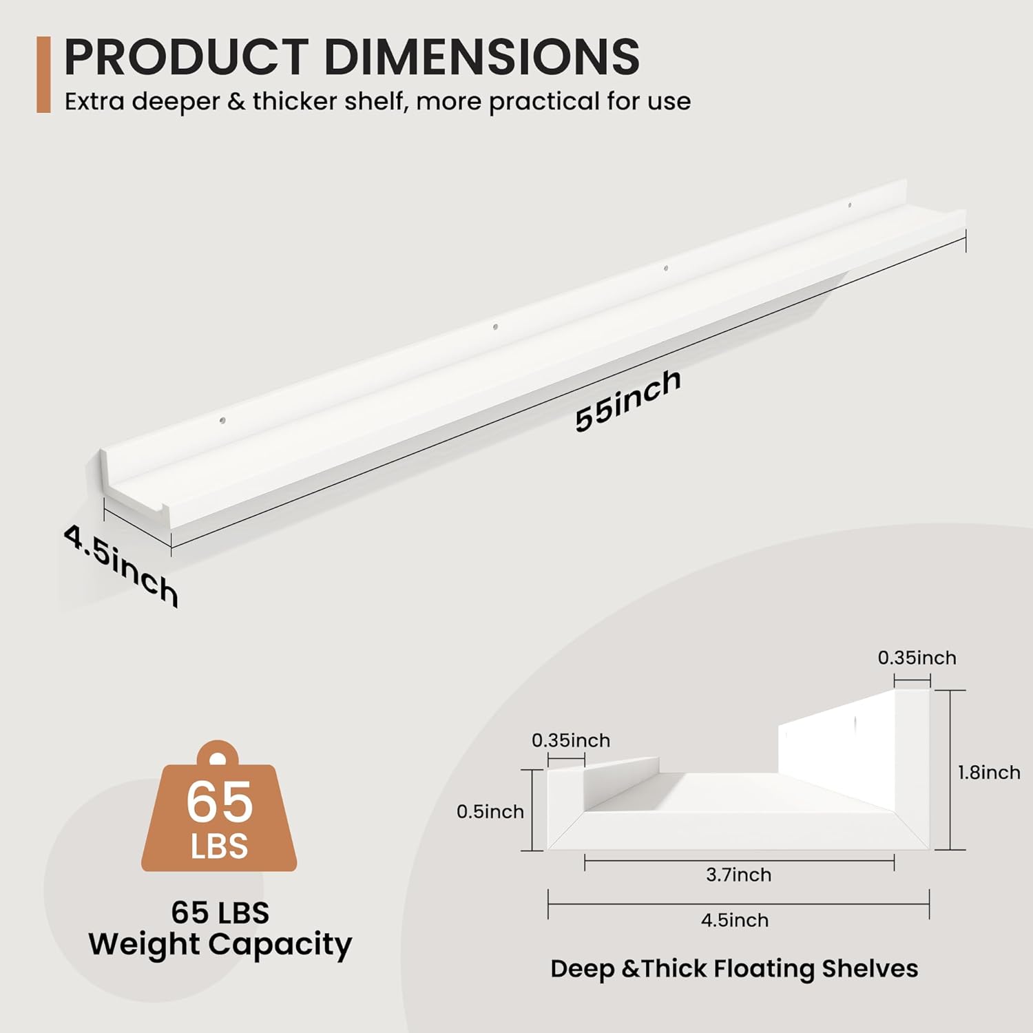 - Enhanced Stability Design: Featuring a secure lip at the front, these floating shelves prevent items from slipping or falling, confidently supporting up to 65 lbs, making these MDF wood shelves ideal for showcasing cherished items.