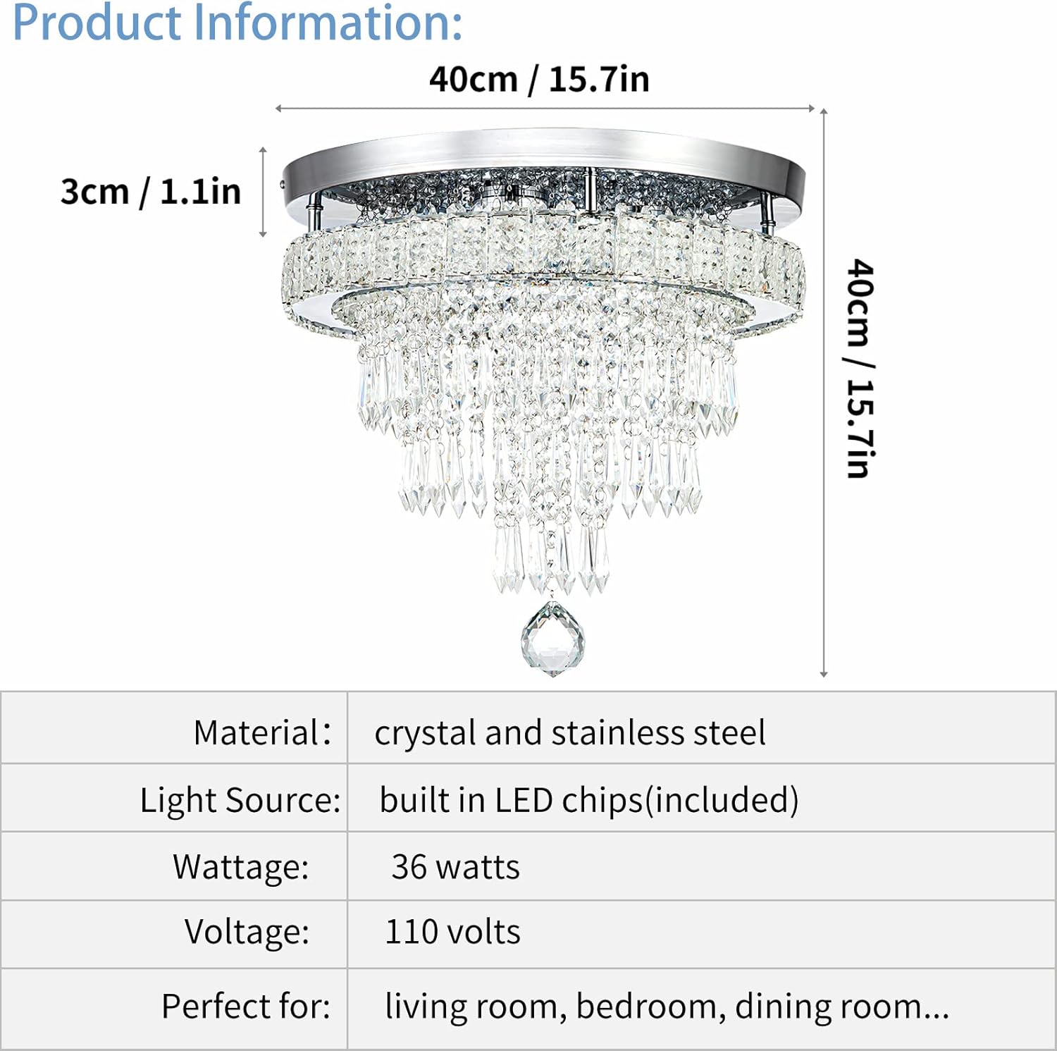 - ✔【LED Chandelier Parameters】overall diameter 15.7 inches*height 15.7 inches, 36 watts, 85-265 volts (perfectly works on 110 volts), chandelier is 90% assembled before packing, only need to hang the 4 tier crystal pendants to the ceiling base when you receive it.