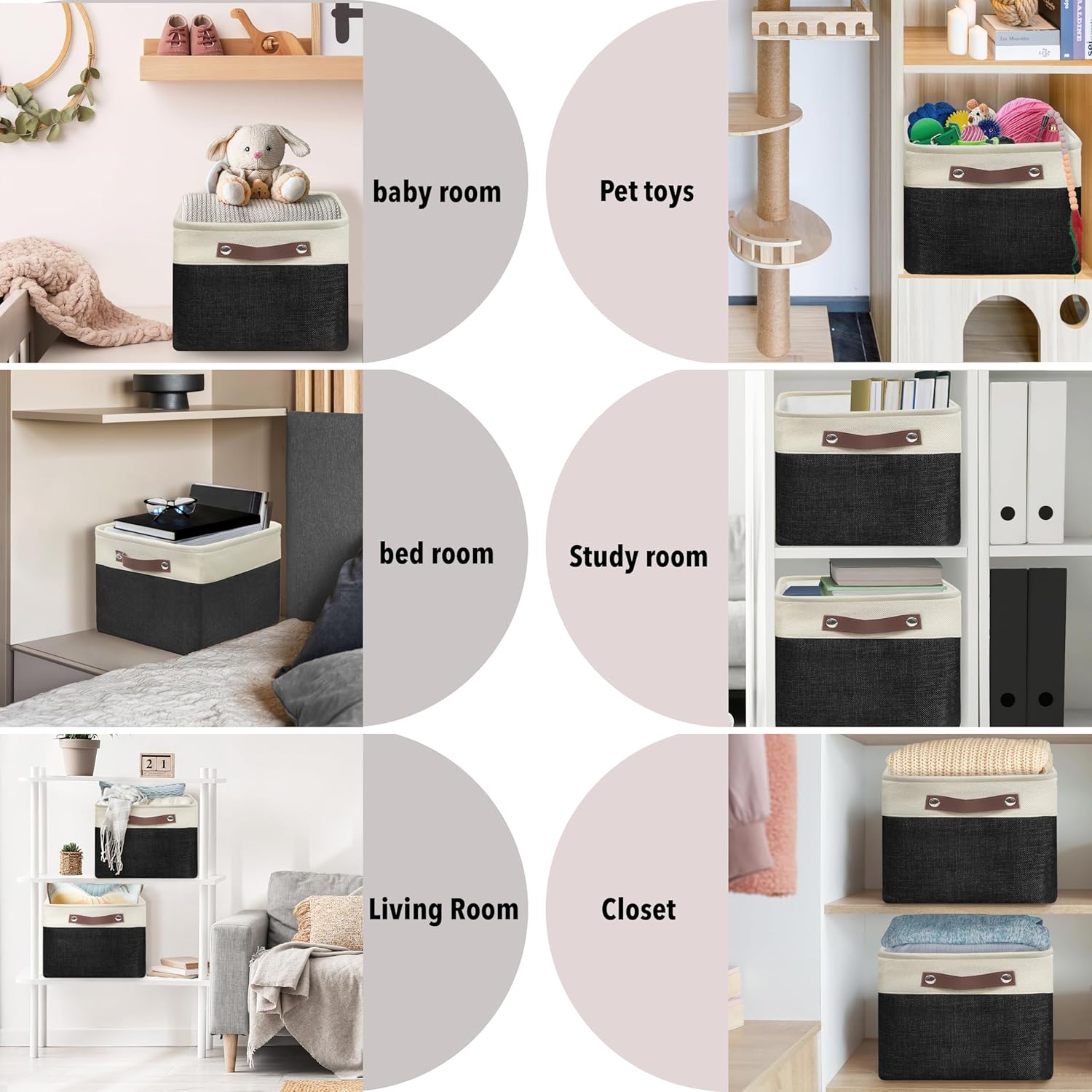 SIMPLE HOUSEWARE Large Fabric Storage Bin, 15" x 11" with Leather Like Handles, 3 Pack, Black