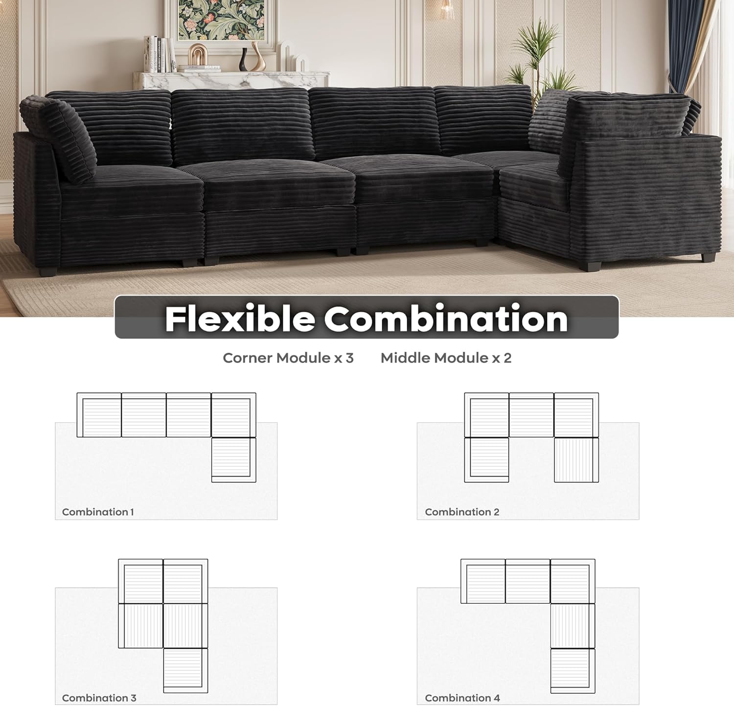 ovios Sectional Sofa Couch with L-Shape Chaise Convertible, Comfy Modular Cloud Couches with Deep Seat, Modern Upholstered Plush Corduroy Sofas Set for Living Room, 5-Seater, Black