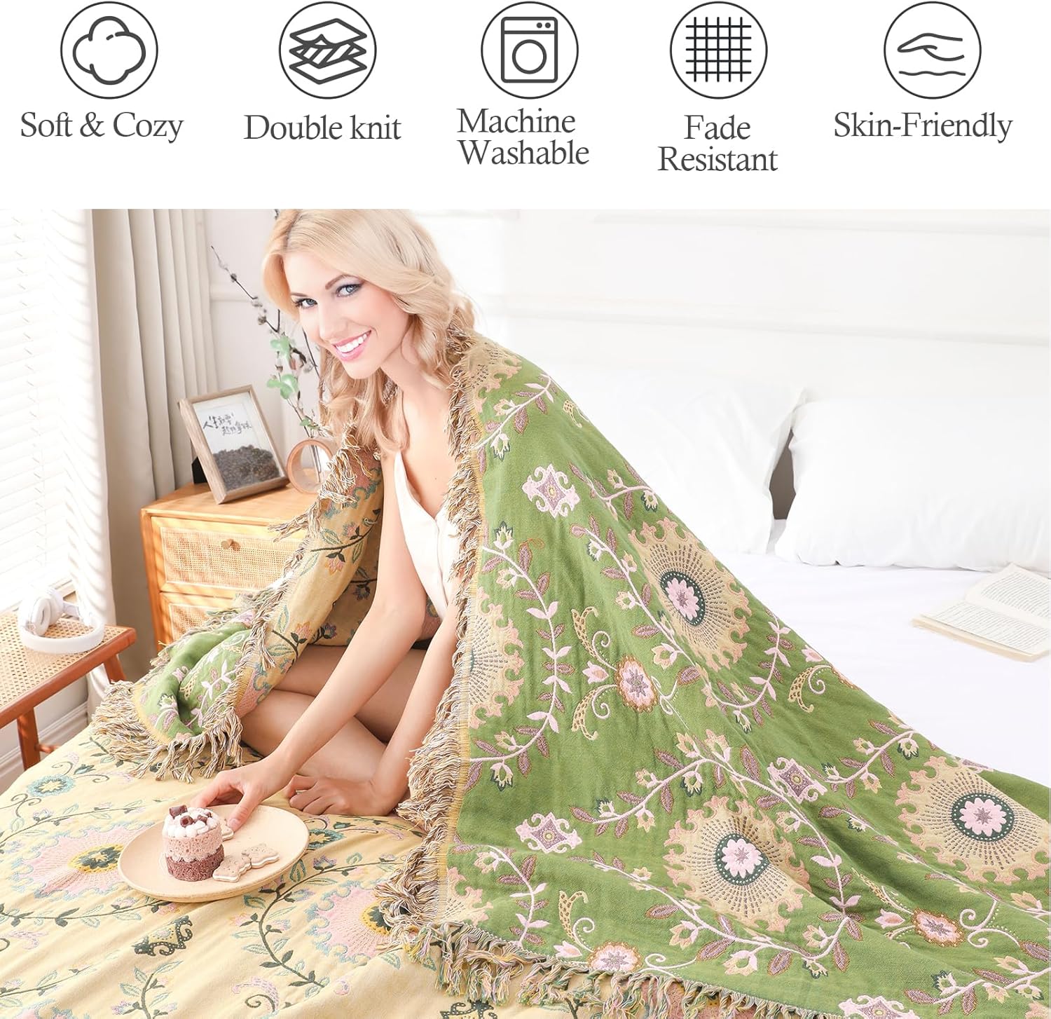 Snycler Boho Throw Blanket 60"x80" - 100% Cotton Ultra Soft Rustic Quilt, Green Floral Printed Farmhouse Decor for Bed, Sofa, Couch, Chair - All Season Cozy Blanket