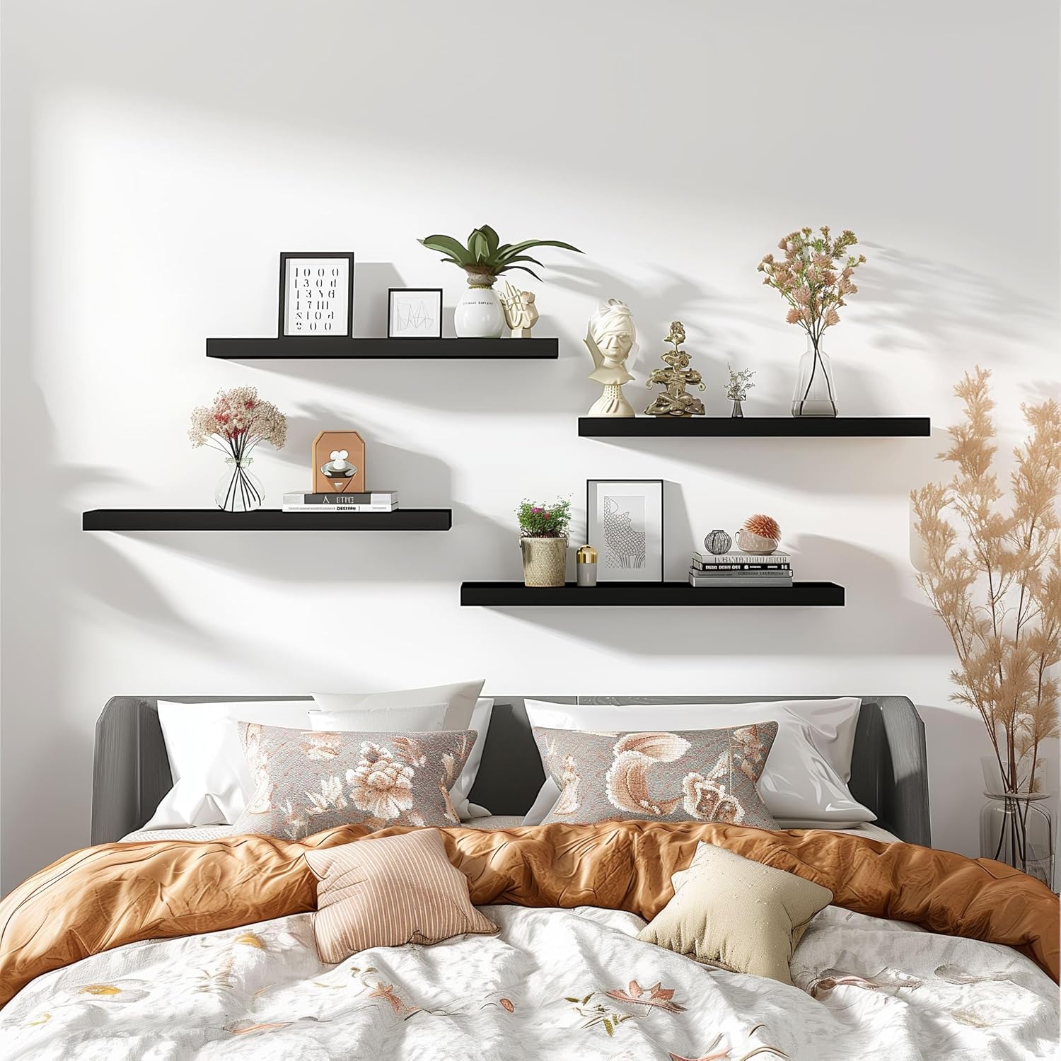 Wood Floating Shelves for Wall Decor, Rustic Wall Shelves for Bedroom Bathroom Kitchen Living Room, Set of 4 Black 24 Inch