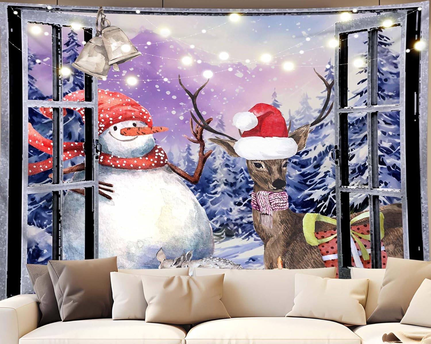 QGHOT Christmas Window Tapestry Wall Hanging Christmas Backdrop Winter Window Wall Decor Xmas Snowman Deer Tapestries for Bedroom Living Room Dorm Holiday Party Decoration, Extra Large