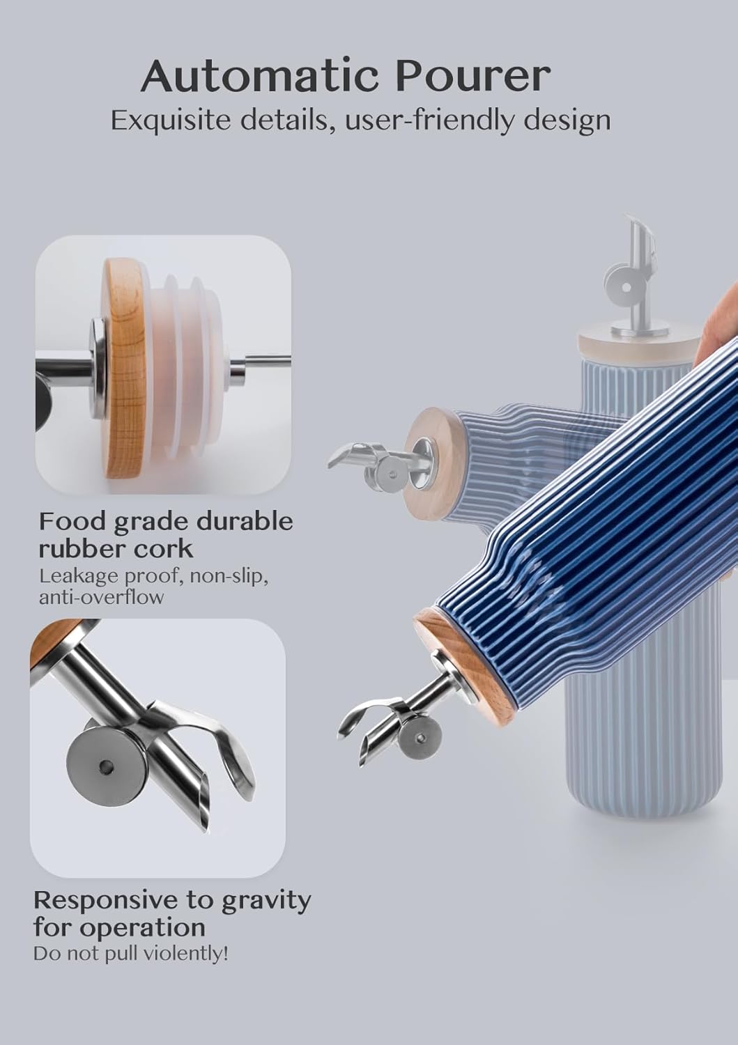 - Gravity-Driven Auto Spout: The gravity-driven spout opens automatically when the bottle is tilted and closes when it is upright, offering precise pouring control without drips or spills. Simplify your kitchen with this multi-use oil and vinegar dispenser bottle.