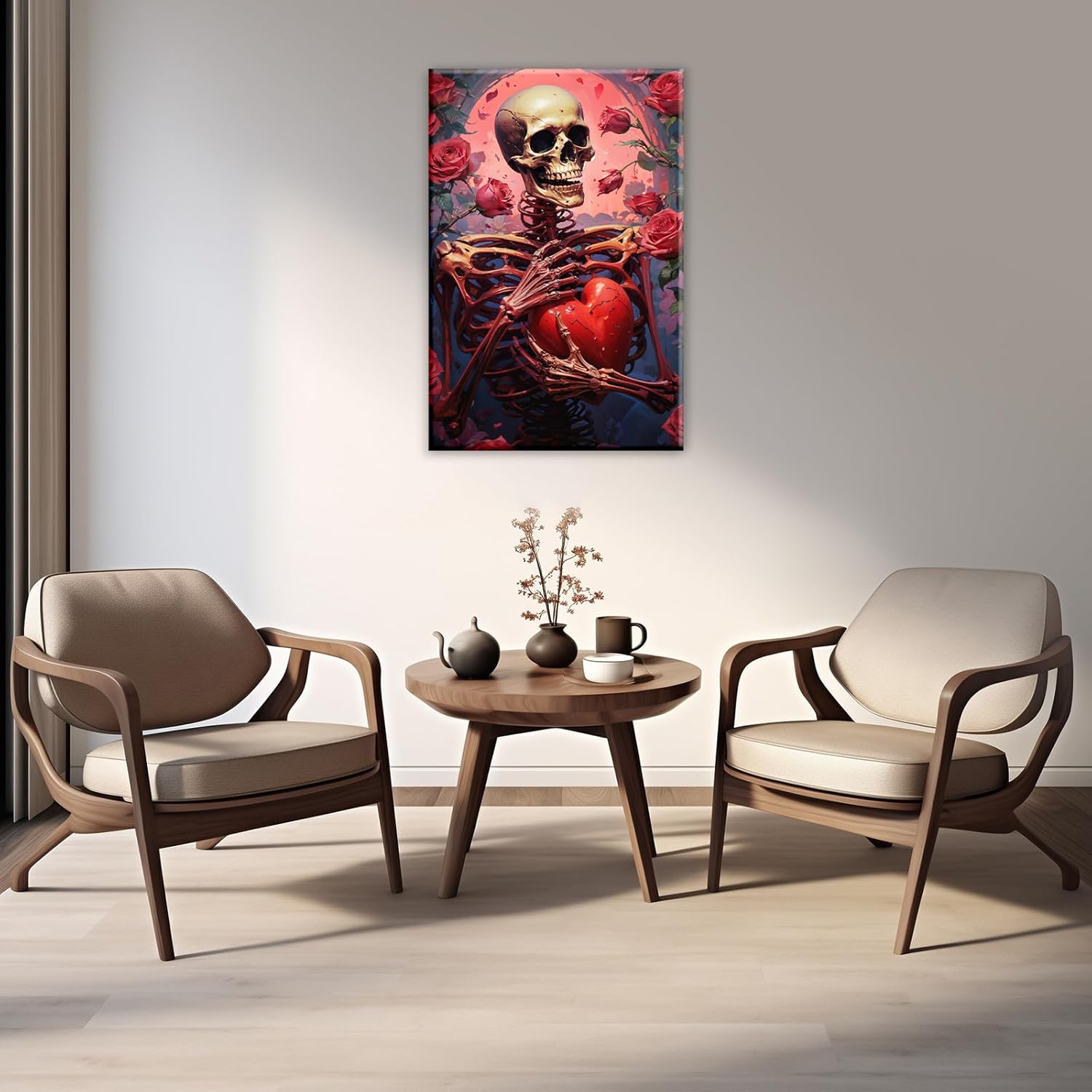 OAAPITI Skull Skeleton Canvas Wall Art Skull Holding Heart Picture Print Romantic Theme Painting Artwork Gothic Poster Wall Decor Living Room Halloween Decor(Artwork-1,28"x42")