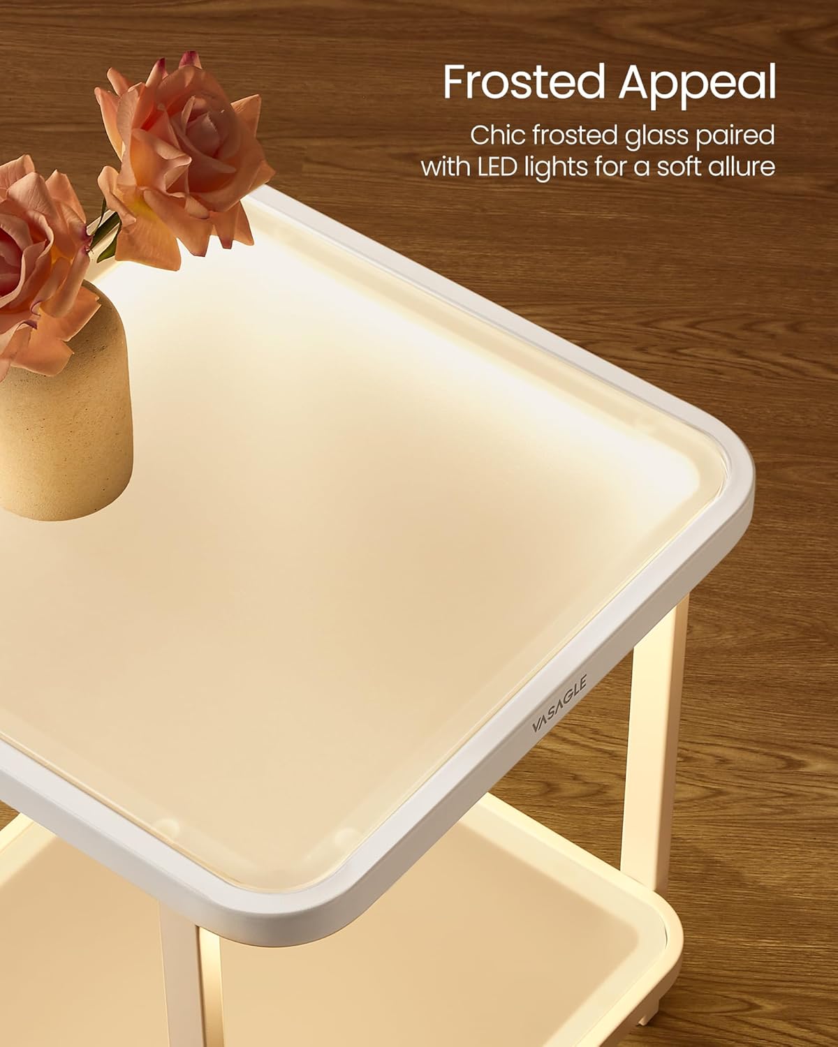 VASAGLE End Table, 2-Tier Side Table with LED Lights, Modern Nightstand, Square Bedside Table, Frosted Glass, Bottom Shelf, for Bedroom, Cloud White and Pearl White ULET232W01