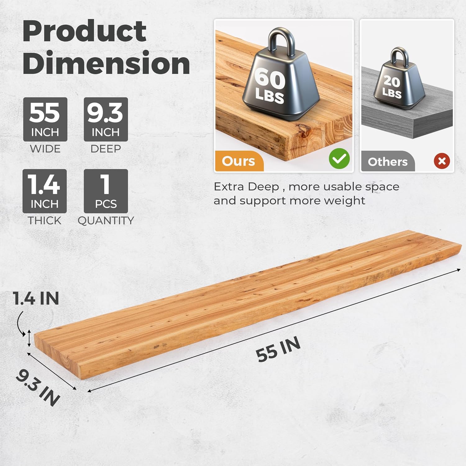 - 9.3" DEEP-MORE SPACE&MORE TIDINESS: Measuring 9.3 inches deep and 1.4 inches thick, the floating wood shelves perfect for various scenes and have a strong storage capacity, from books and photos to small plants. Perfect for any room in your home, including living rooms, offices, kitchens, and more