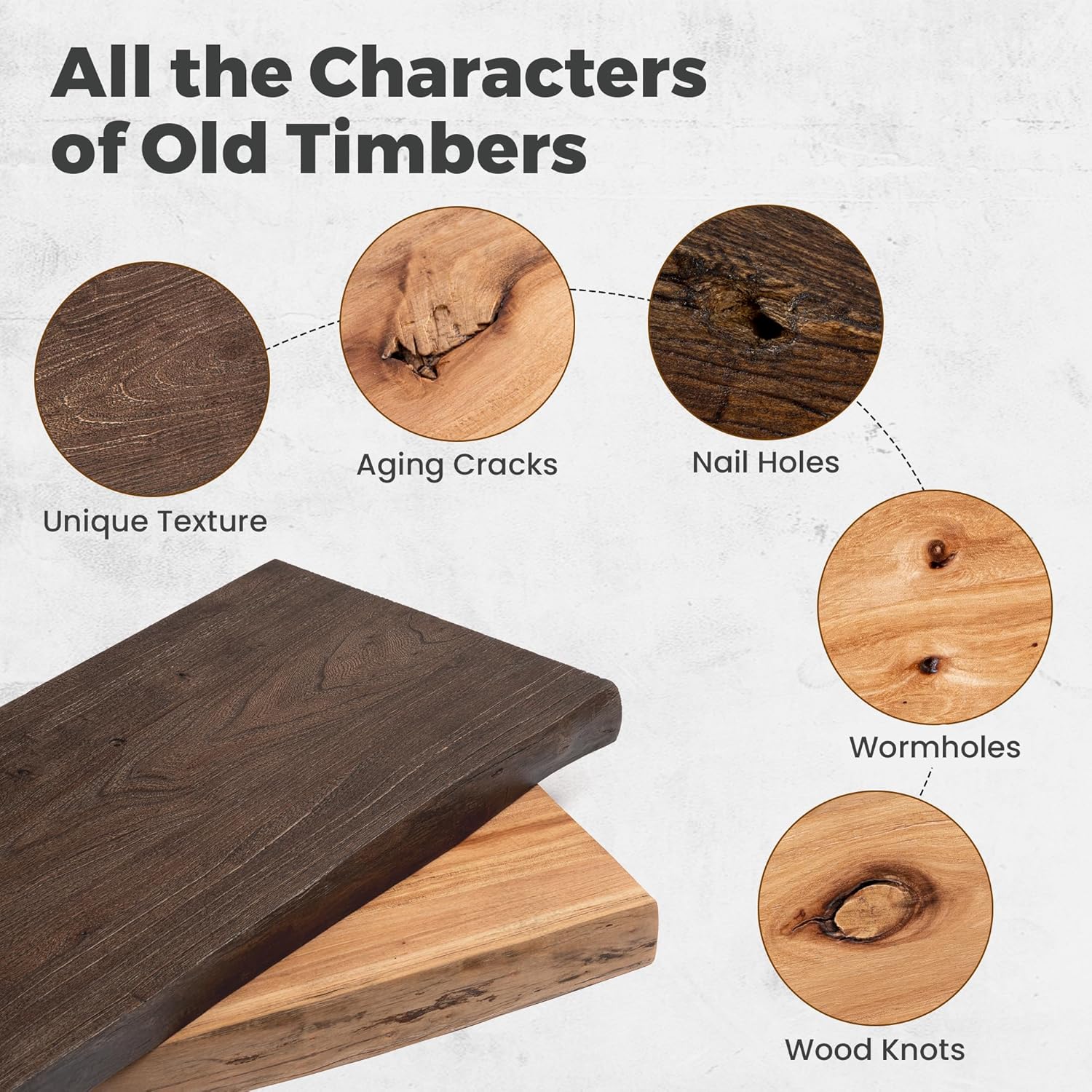 - RECLAIMED ELM WOOD SHELVES: Our wooden floating shelves are handcrafted from solid reclaimed elm wood, each floating shelf showcases the natural beauty of wood knots, grain, and texture. The reclaimed elm wood features knots, cracks and imperfections that tell a story of time and use. These shelves exude a rustic and aged appearance, adding charm and character to your home decor