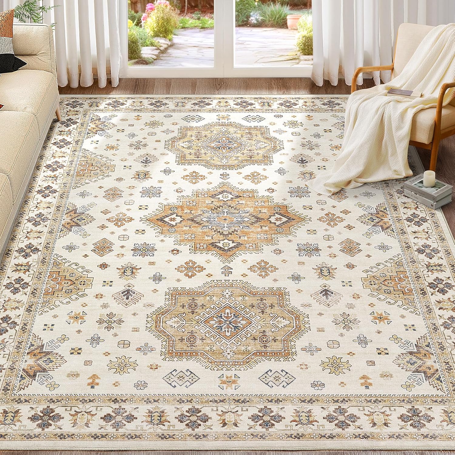 Washable Area Rugs for Living Room - 7x9 Neutral Vintage Distressed Floral Farmhouse Boho Large Soft Floor Rug Indoor Non Slip Carpet for Living Room Bedroom Dining Room Office - Orange/Yellow/Beige