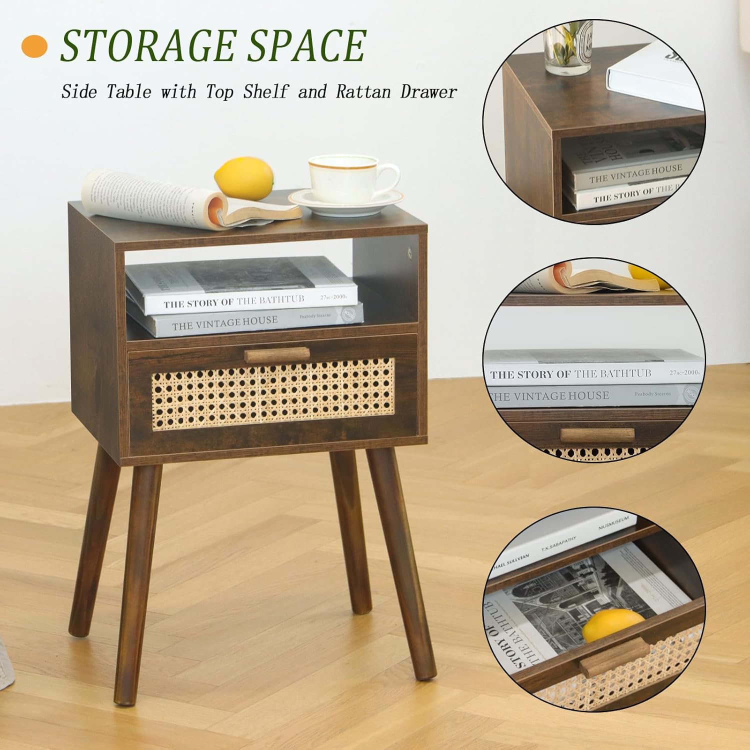 - Sturdy Side Table: The solid wood legs, elegant square tabletop, walnut colour surface and natural rattan constituted this mid century nightstand. It is ready to hold everything you need with easy reach