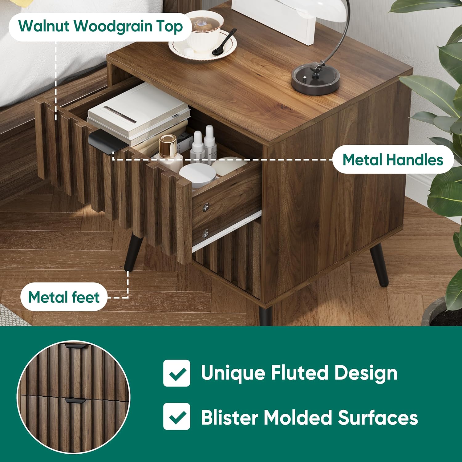 Smuxee Walnut Wooden Night Stand, Mid Century Nightstand with 2 Fluted Drawers, Bedside Table with Metal Feet, Modern End Side Table for Bedroom