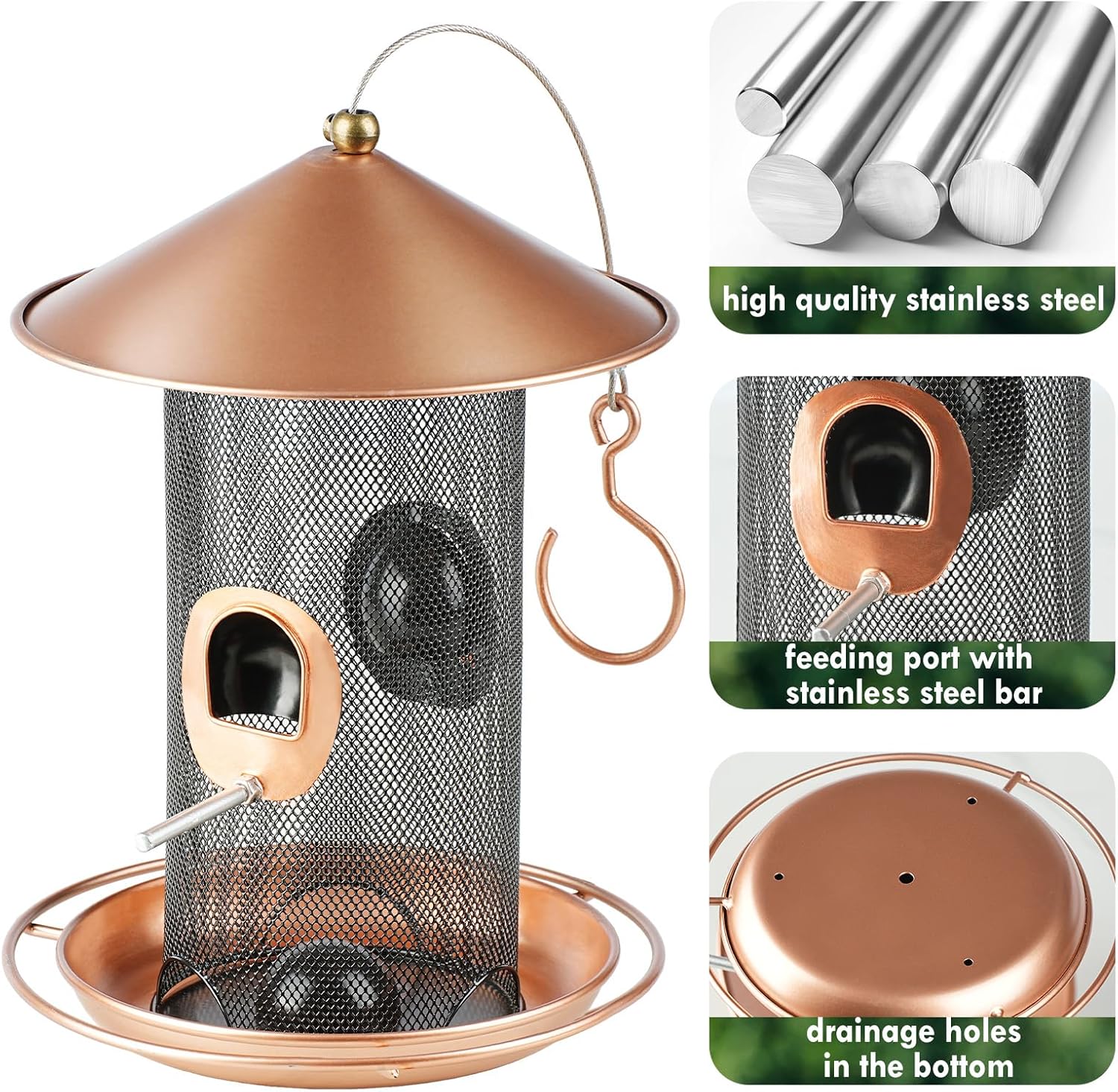 Bird Feeder for Outdoor, Metal Wild Bird Feeder Hanging Outside, 7.5" Copper Roof and 360 Degree Feeding Tray with 2 Extra Feeding Ports, 3 Lbs Bird Seeds Capacity