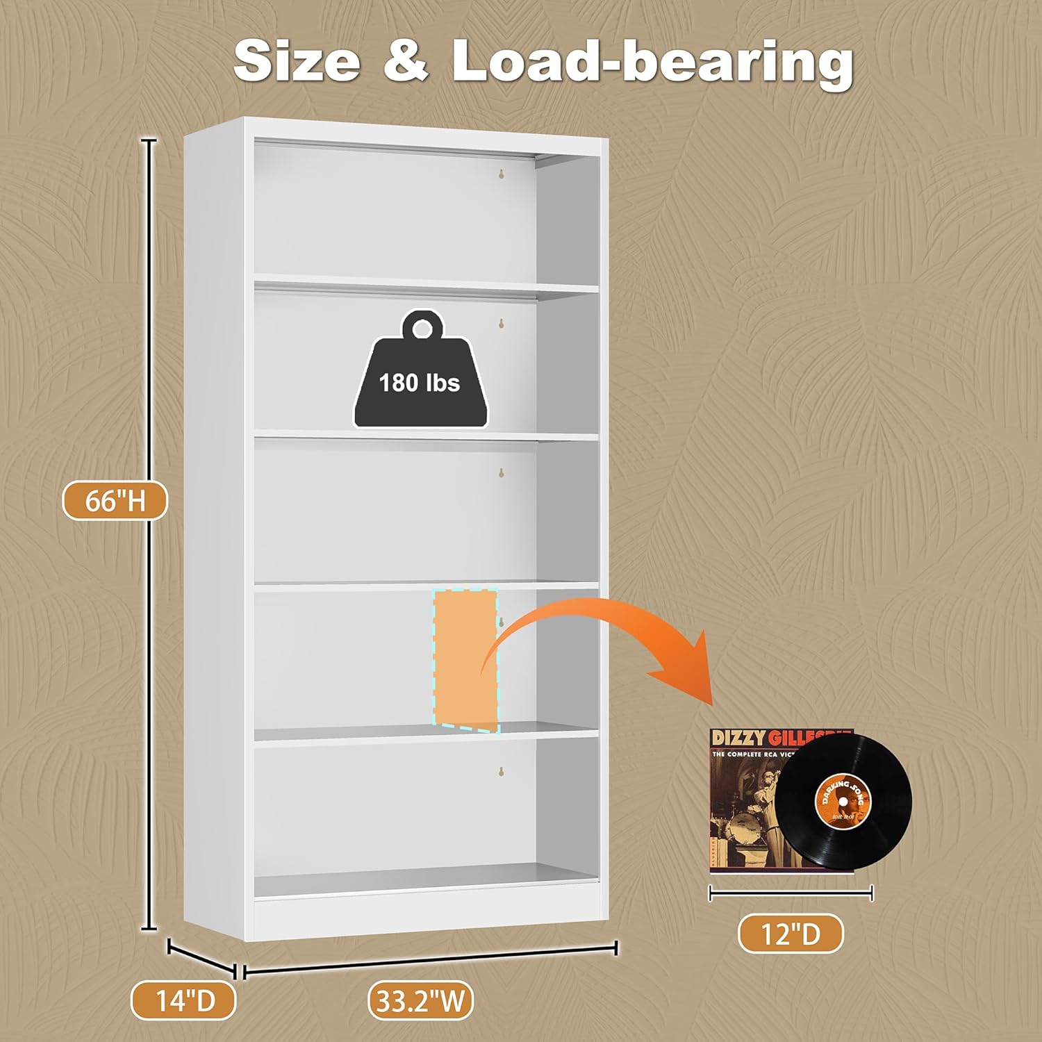 - 【Deep Wide Bookcase】5 Tier bookshelf has a deep storage for maximum space. The total size of the bookshelf is 66 "H * 33.2" W * 14 "D. Large storage unit bookcase for vinyl records. Wide storage shelf has a large display space to meet the needs of work and life. While storing more DVDs, Blu-Rays, videogames, CD's,music, movie , and models on the deep bookshelf, there is no need to worry about items falling off due to the spacious space.