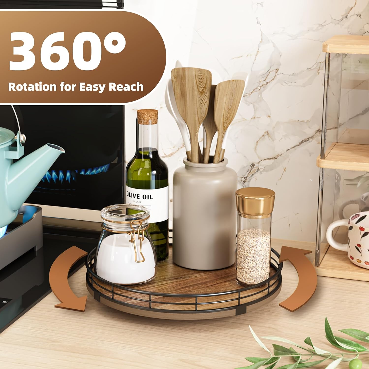 - 360°Smooth Rotation - The lazy susan turntable rotates smoothly and silently, placed next to the stove for easy access to condiments, spices, olive oil and cooking supplies. Placed next to the sink to display soap lotion. Thoughtful kitchen countertop organizers to rid your life of clutter!