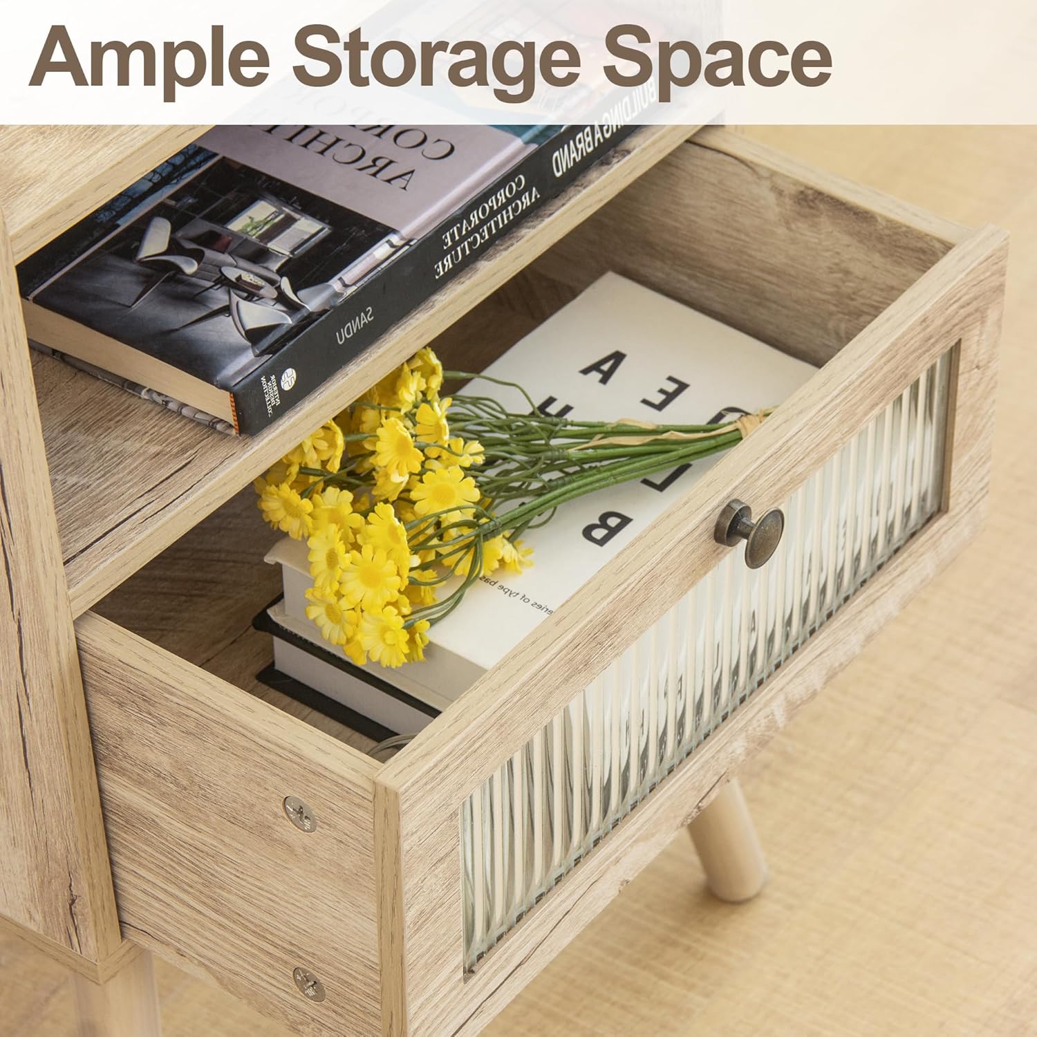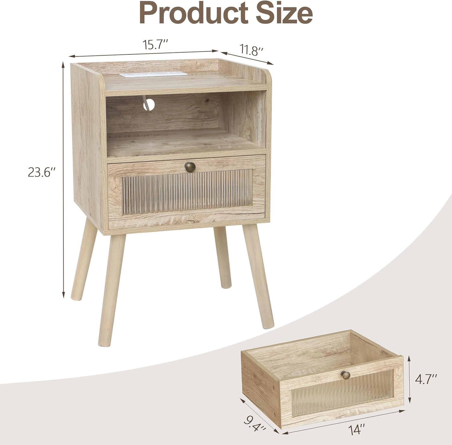 - Elegant Design: The nightstand is designed with a glass decorative drawer paired with a brown wooden drawer handle, which adds a modern and stylish vibe to your home. The dimensions of the bedside table: are 11.8''D x 15.7''W x 23.6''H. The drawer dimensions: are 9.4''D x 14''W x 4.7''H