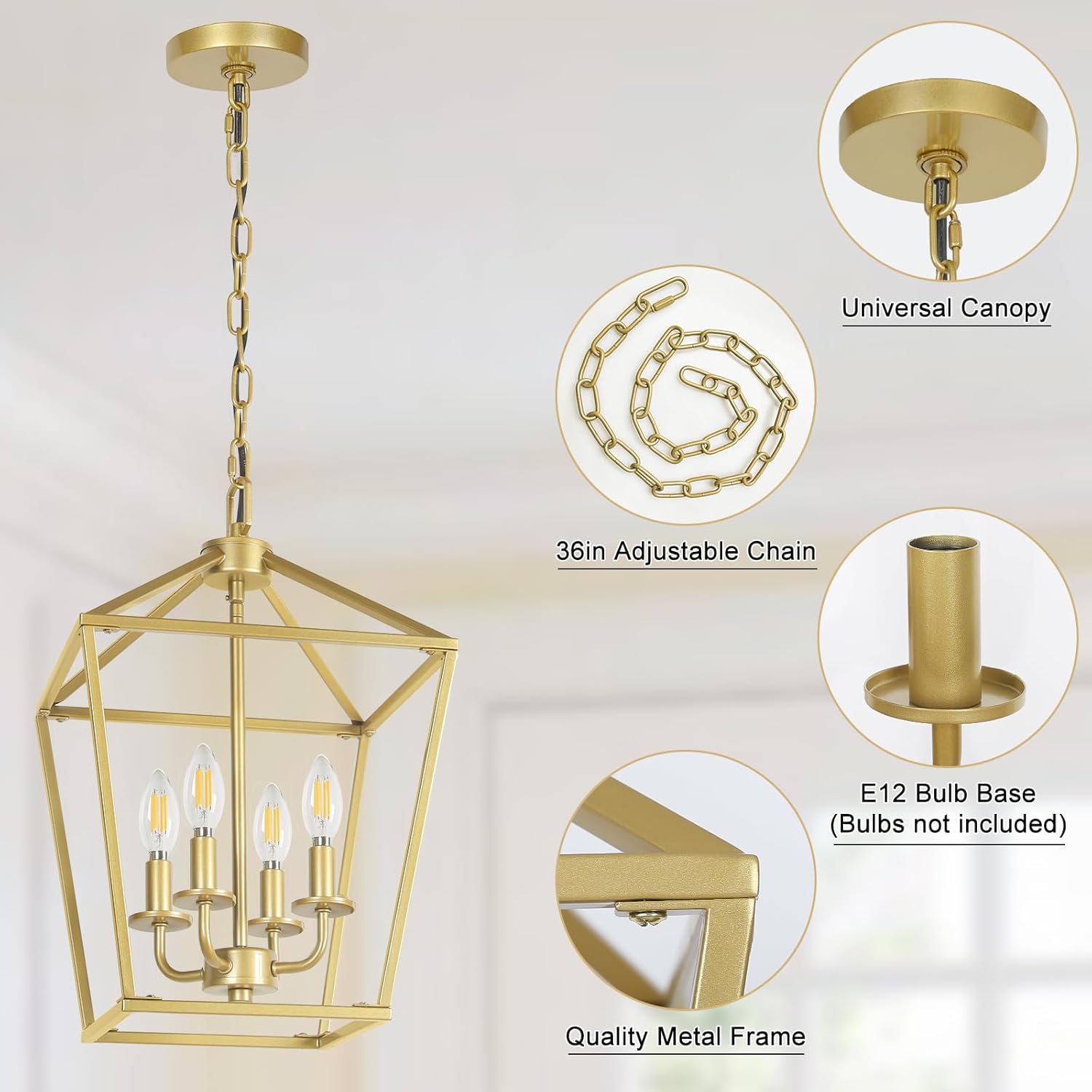 4 Light Gold Chandelier, Industrial Ceiling Light Lantern Light Fixtures with Farmhouse Metal Cage Adjustable Height Rustic Geometric Hanging Light E12 Base for Kitchen Island, Entryway, Indoor