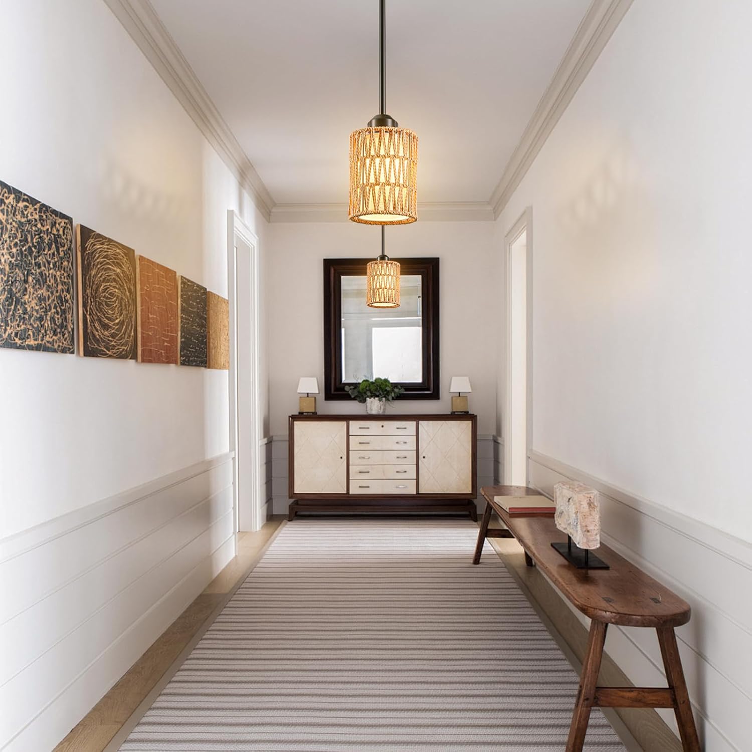 - Adjustable Height for for Any Space: Customize your lighting with 4 hanging poles (12"x3 and 6"x1), allowing the boho hanging light rattan lamp to be adjusted between 5.87 inches and 51.87 inches. Ideal for flat or sloping ceilings, making it a versatile farmhouse dining room light fixture or pendant lighting for kitchen island.