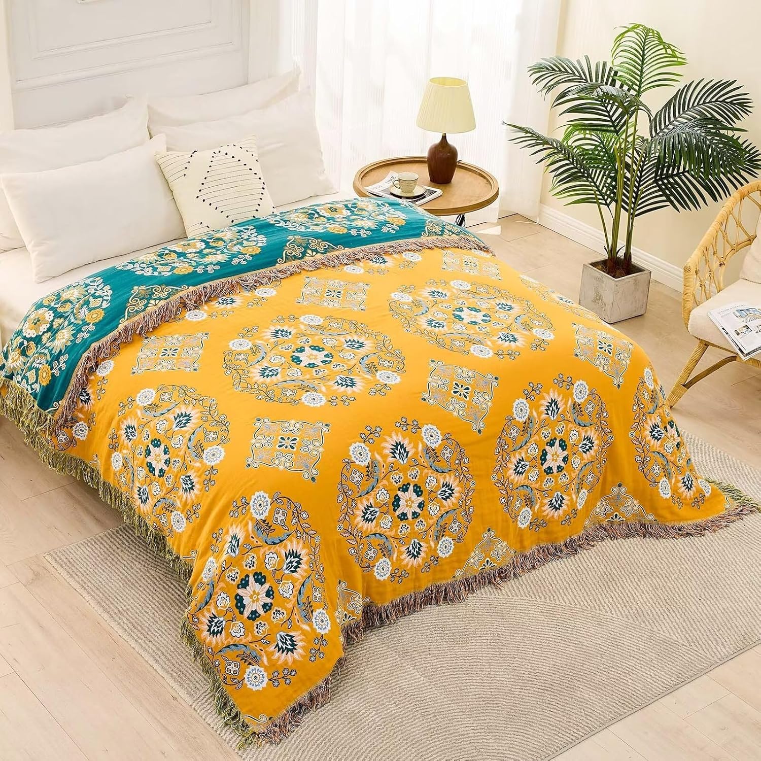 Boho Throw Blanket, 100% Cotton Ultra Soft Luxury Throw Rustic Quilt, Floral Printed Farmhouse Decor Bed Summer Blankets, All Season Rustic Reversible Bohemian Throw for Bed (80"x90" Yellow