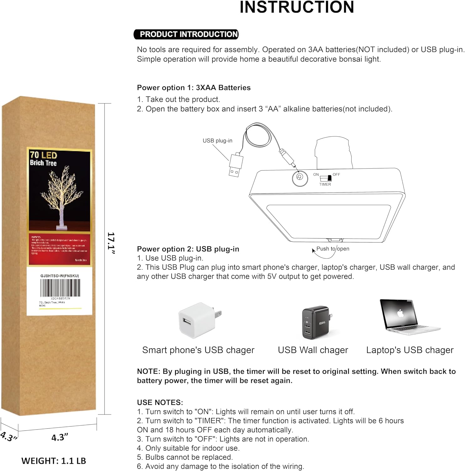 - 2 Power Modes with Timer: 4.5V DC adapter or 3AA batteries(battery not included). With TIMER function included for a convenient use, 6 hours on/18 hours off, long duration and energy saving