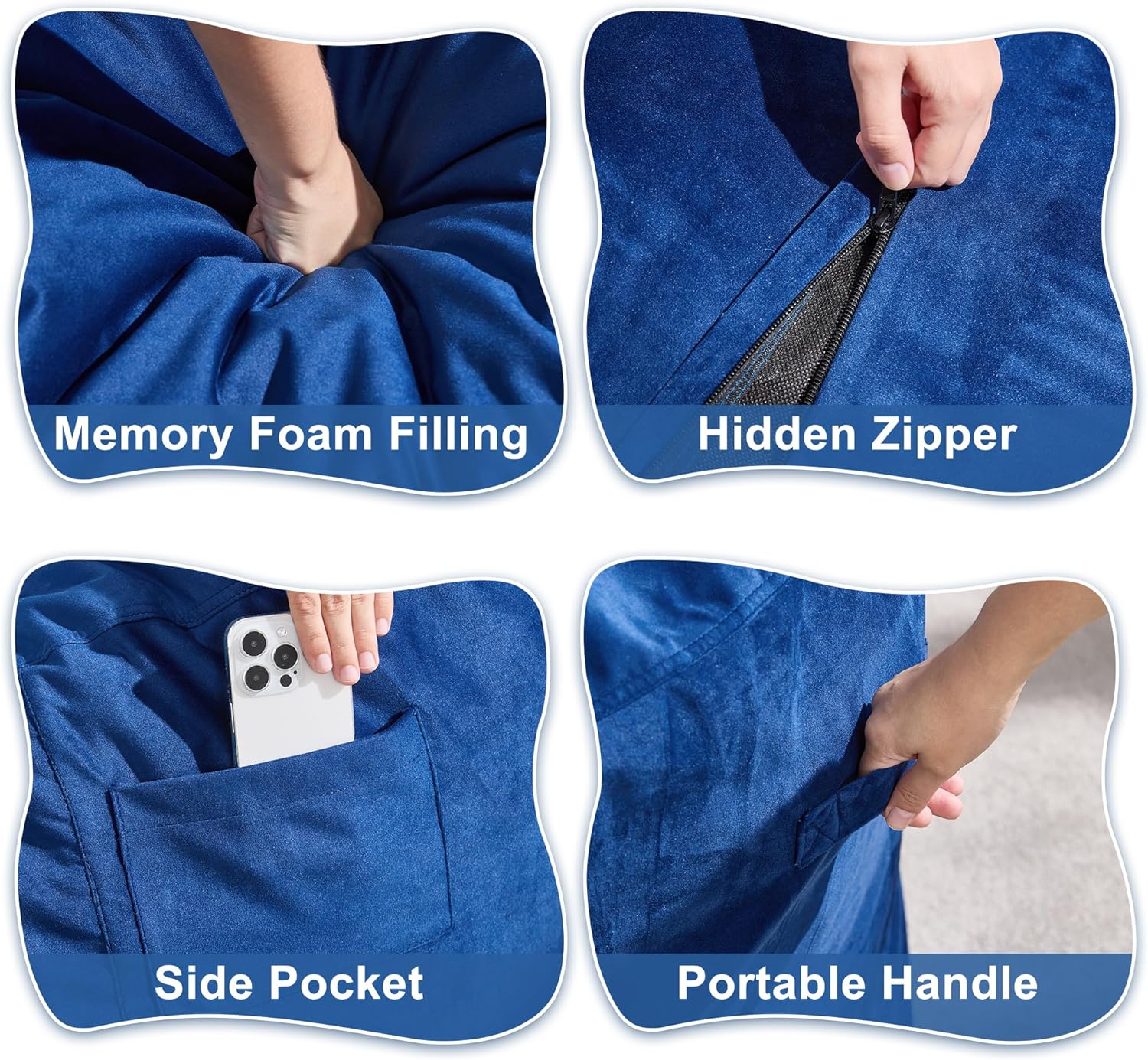 - Convenient Design: Our adult bean bag chair is designed with handle so you can move the giant bean bag chair wherever you want. The adult bean bag chair has a medium sized pocket on the side to store your phone, remote control, books and some small items. With the hidden zipper, you can remove the bean bag cover and throw it in the washing machine for cleaning.