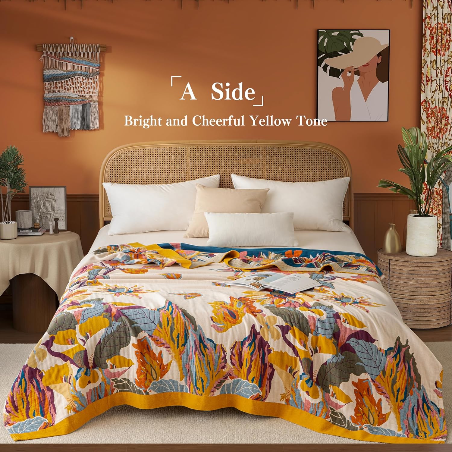 Boho Throw Blanket Twin Size, Soft Cozy Cotton Muslin Quilt Blanket for Bed Decor, Floral Patterned Couch Sofa Chair Cover, Vintage Farmhouse Cottage Tapestry Woven Blanket, Yellow&Blue