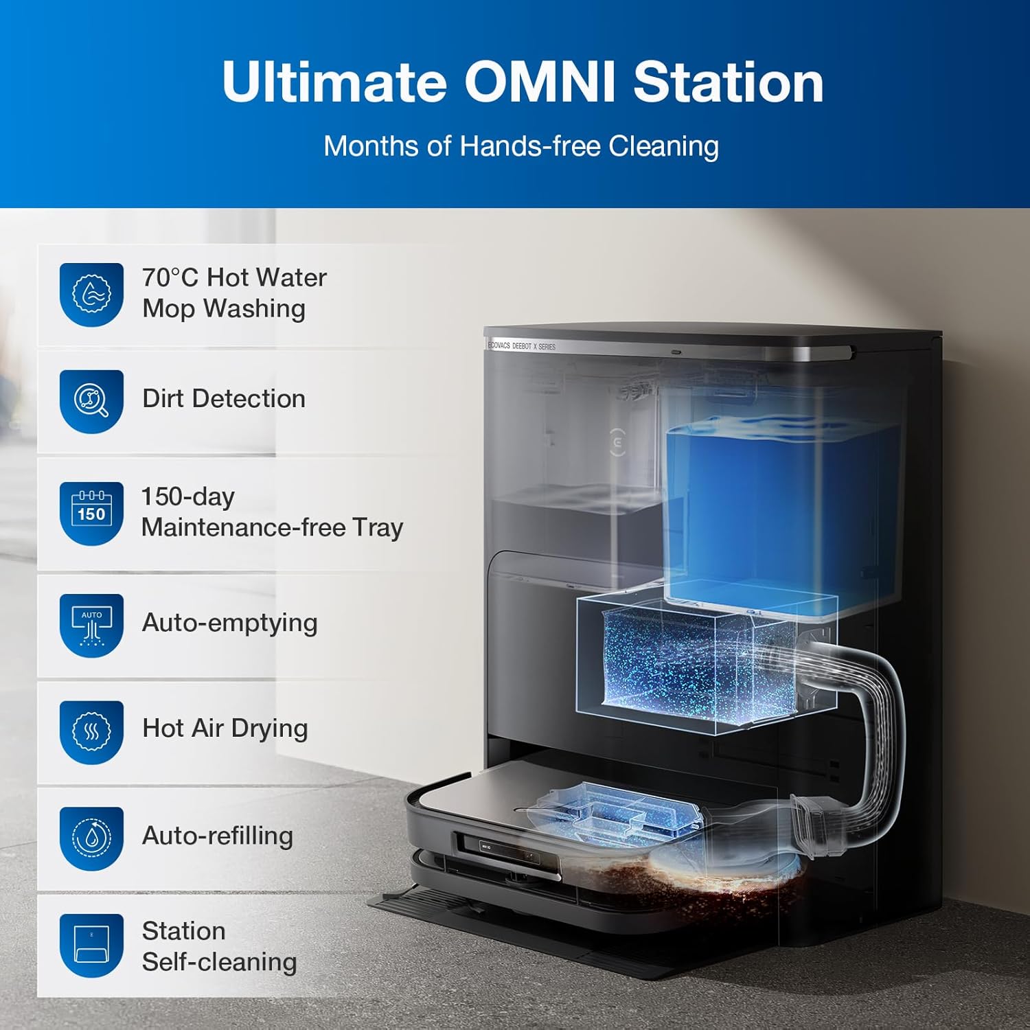 - Upgraded All-in-One OMNI Station - The all-in-one OMNI station supports 70℃ hot-water mop washing, self-emptying, auto water refilling and hot-air drying. This multi-functional station prepares your DEEBOT X5 PRO OMNI for any cleaning challenge, embodying the essence of convenience and readiness.