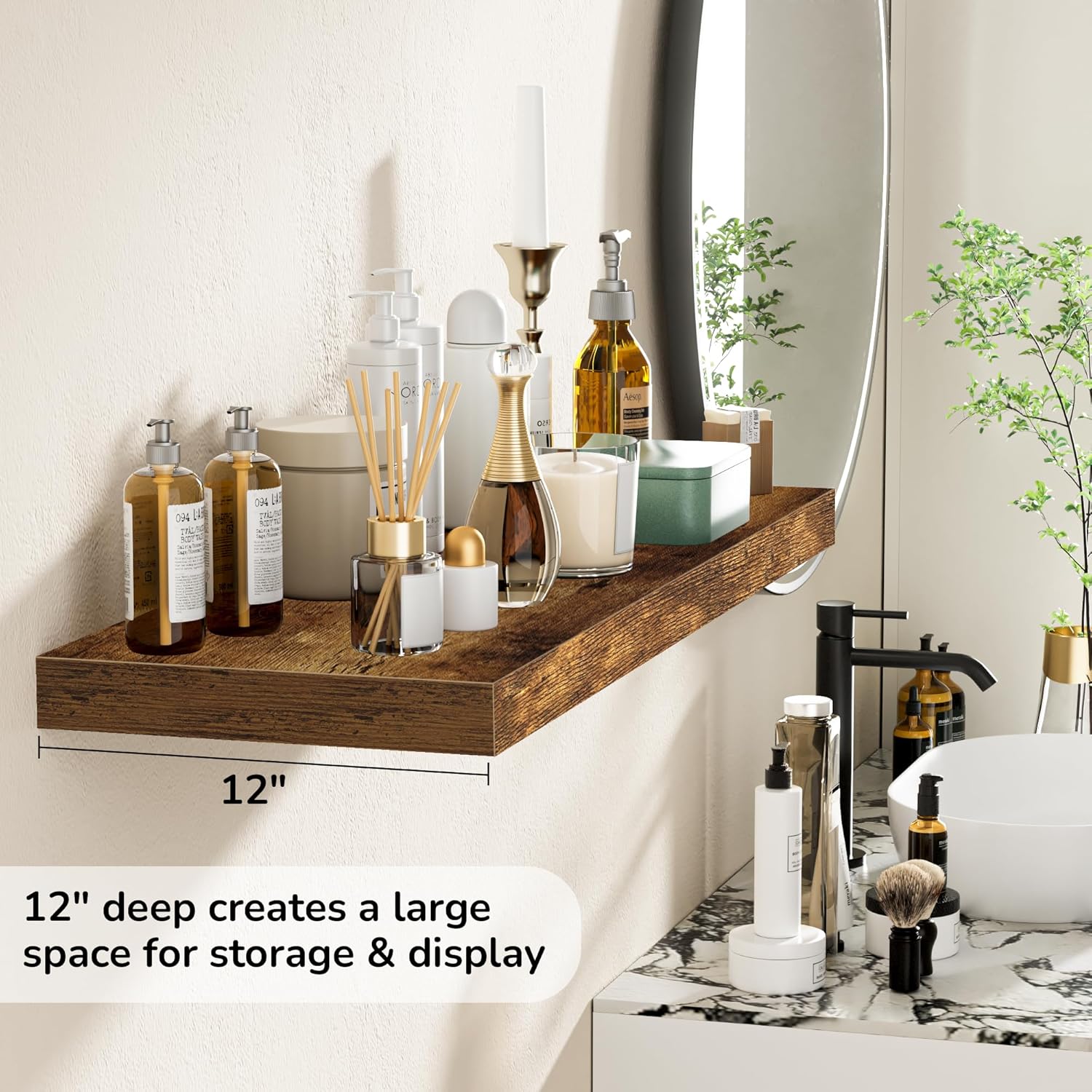 Fun Memories Floating Shelves - 2 Pack 12 Inch Rustic Wooden Wall Shelves - Extra Deeper & Thicker Wall Mounted Storage Shelf for Living Room, Kitchen, Farmhouse - 36" W x 12" D x 1.8" H - Brown