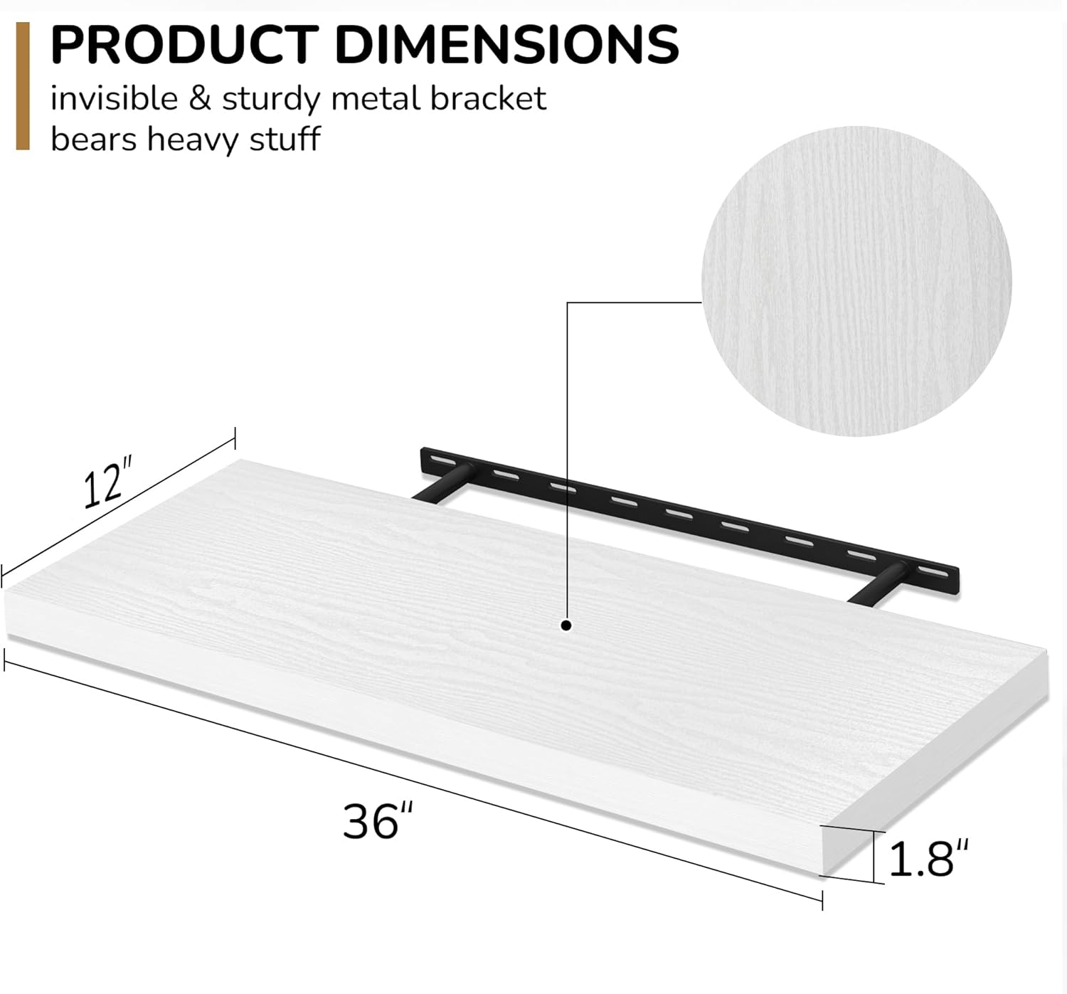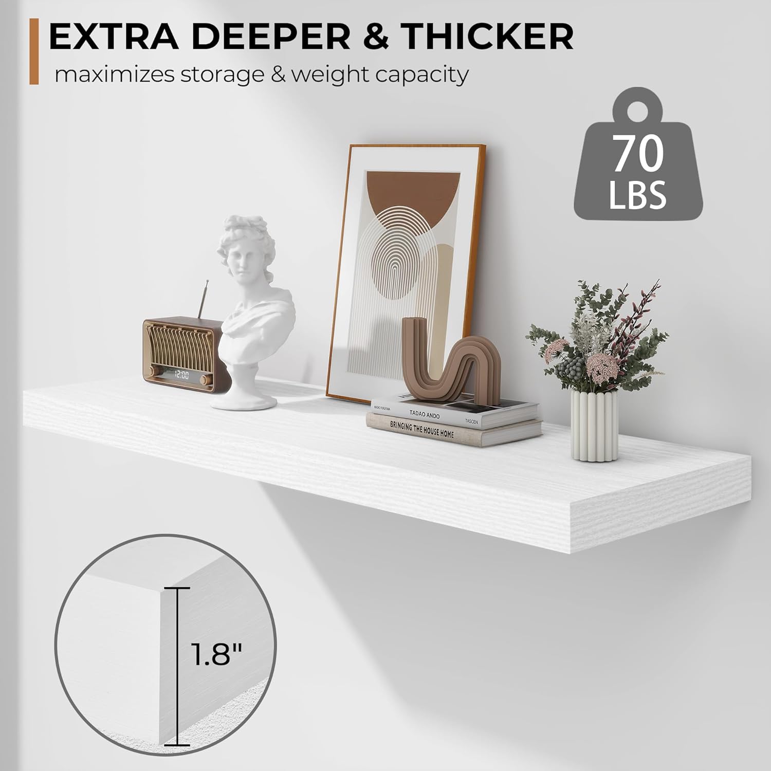 - Extra Deeper & Thicker - Each board measures 36"W x 12"D x 1.8"H. Extra deeper and thicker design in order to bring maximizes storage space and weight capacity, even hold up to 70 lb each. This floating shelf taking up zero square feet, reduces clutter and highlights décor in compact spaces.