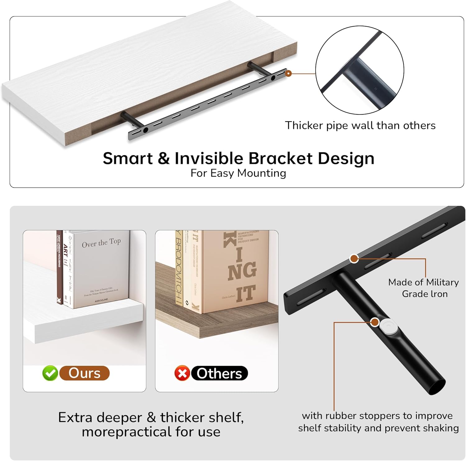 - Versatile & Multi-Scene Functionality: Our floating shelves are available in a variety of sizes and thicknesses, allowing you to choose the perfect fit for your space. Use them in the bathroom to store beauty products, hair care items. In the bedroom, they can hold books, cosmetics, and personal items. In the kitchen, they’re perfect for spices, jars, or small utensils. Or display photo frames, trophies, or collections in the living room. These shelves efficiently use wall space to create a tidier, more spacious feel in any room.