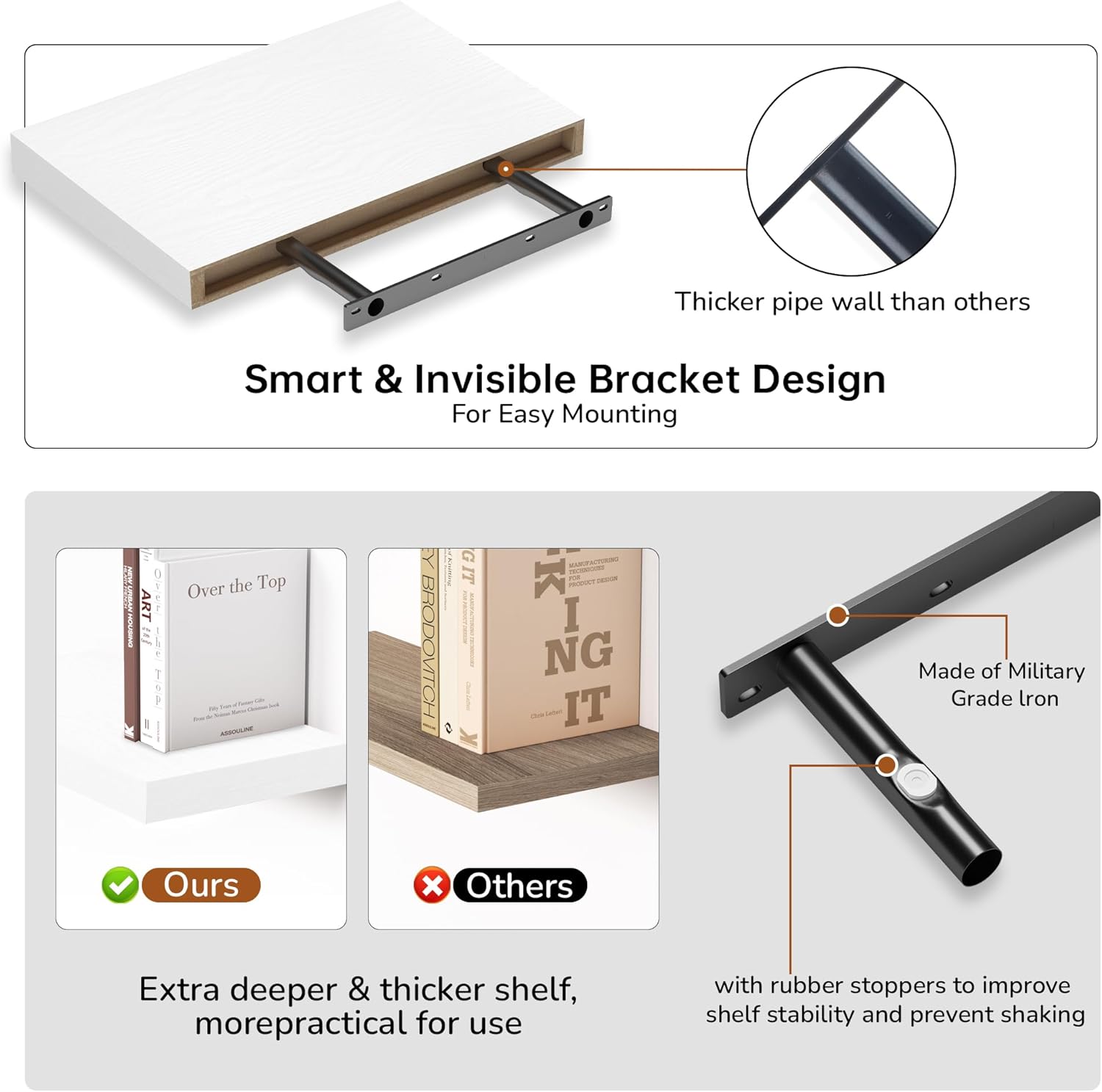 - Versatile & Multi-Scene Functionality: Our floating shelves are available in a variety of sizes and thicknesses, allowing you to choose the perfect fit for your space. Use them in the bathroom to store beauty products, hair care items. In the bedroom, they can hold books, cosmetics, and personal items. In the kitchen, they’re perfect for spices, jars, or small utensils. Or display photo frames, trophies, or collections in the living room. These shelves efficiently use wall space to create a tidier, more spacious feel in any room.