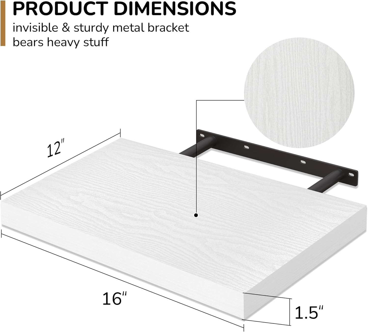 - Extra Deeper & Thicker - Each board measures 16"W x 12"D x 1.5"H. Extra deeper and thicker design in order to bring maximizes storage space and weight capacity, even hold up to 30 lb each. This floating shelf taking up zero square feet, reduces clutter and highlights décor in compact spaces.