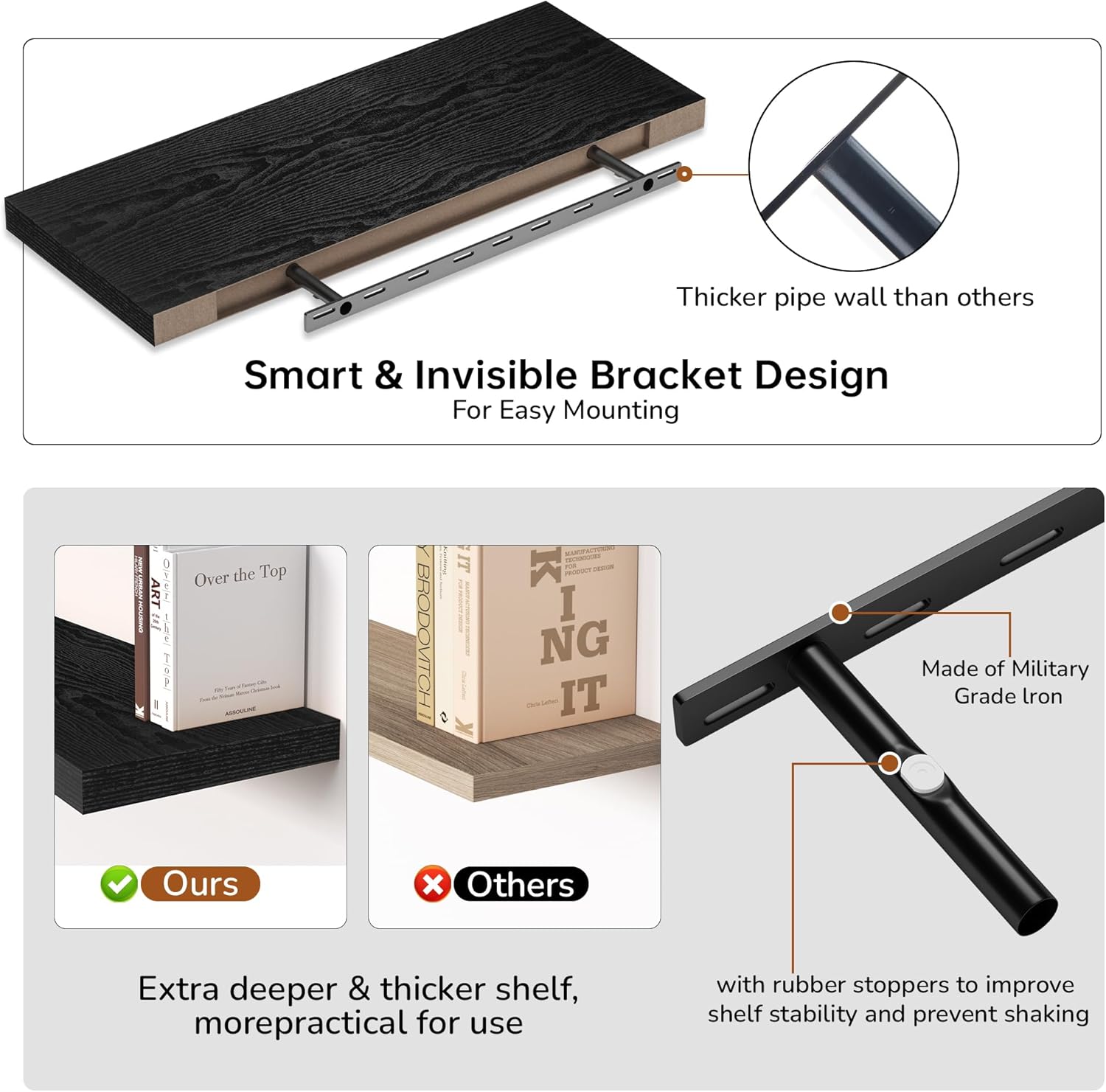 - Extra Deeper & Thicker - Each board measures 36"W x 12"D x 1.8"H. Extra deeper and thicker design in order to bring maximizes storage space and weight capacity, even hold up to 70 lb each. This floating shelf taking up zero square feet, reduces clutter and highlights décor in compact spaces.