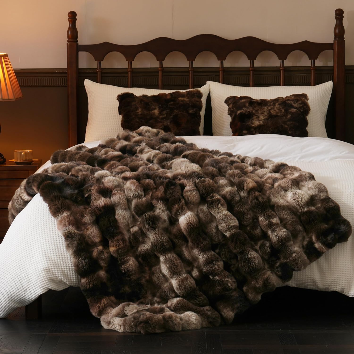 - Luxury Double-Sided Faux Fur: Unlike regular faux fur blankets, ours features double-sided faux rabbit fur. One side showcases a 3D bubble faux fur with a full and dimensional bubble texture, while the other side offers smooth and ultra-soft faux fur. Compared to regular crystal velvet, it's more static-resistant, softer to the touch, and warmer against the skin.